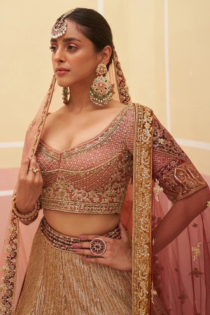 An Onion pink organza double dupatta lehenga set embroidered with traditional zardozi technique using silken threads, dabka, cutdana and sequins underlayed with multi colored organza appliques.