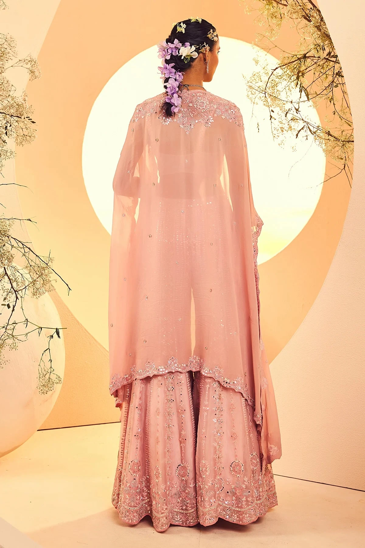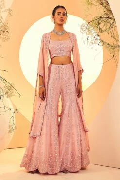 Showcasing a hand embroidered Sharara blouse and a stylized cape. The Sharara features cut dana, pearl sequins and thread embroidery.