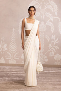 Placement Embroidered Jacquard Sleeveless Blouse, paired with a Georgette Embroidered Bordered Flat Saree and Crepe Petticoat.