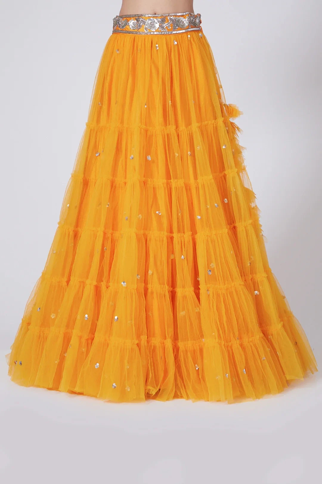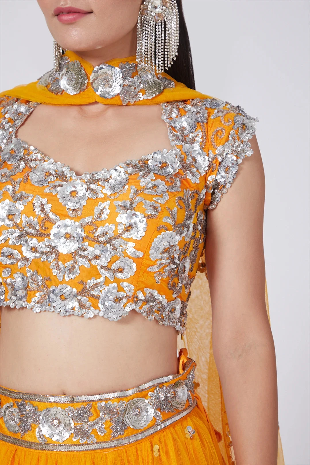 Featuring A Cheese Orange Lehenga In Net Base With Sequins Embroidery. It Paired With A Matching Dupion Blouse And A Dupatta.
