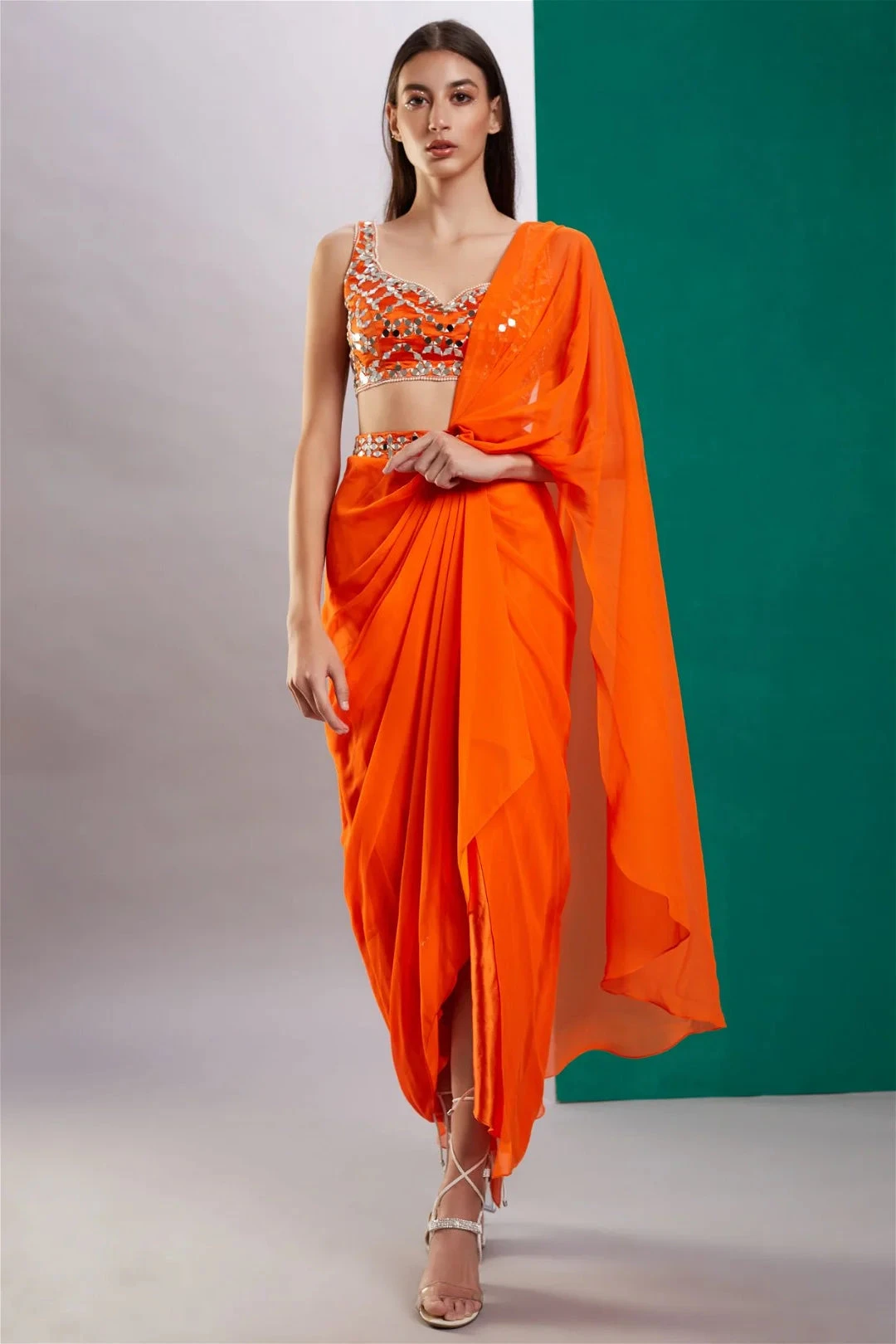 Orange draped saree paired with mirror & pearl embroidered sleeveless blouse. Comes with mirror embellished belt.