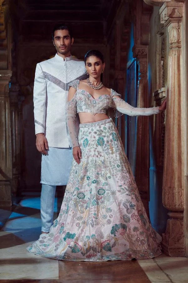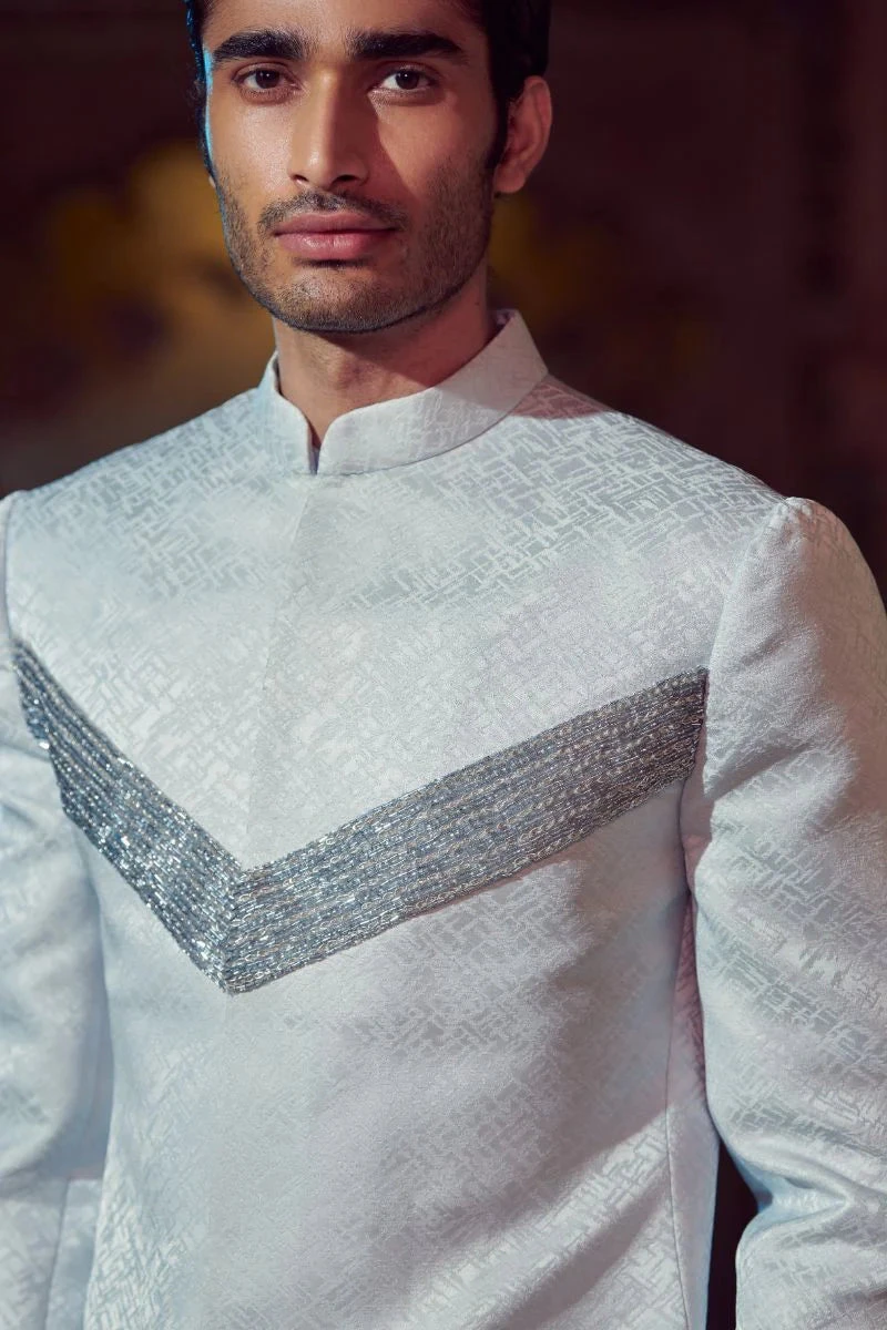 Seen here is a pale blue jacket set, one you can never go wrong with. A color that leaves you with a soothing effect embellished with a v-shaped sequins embroidery on the placket & sleeves.