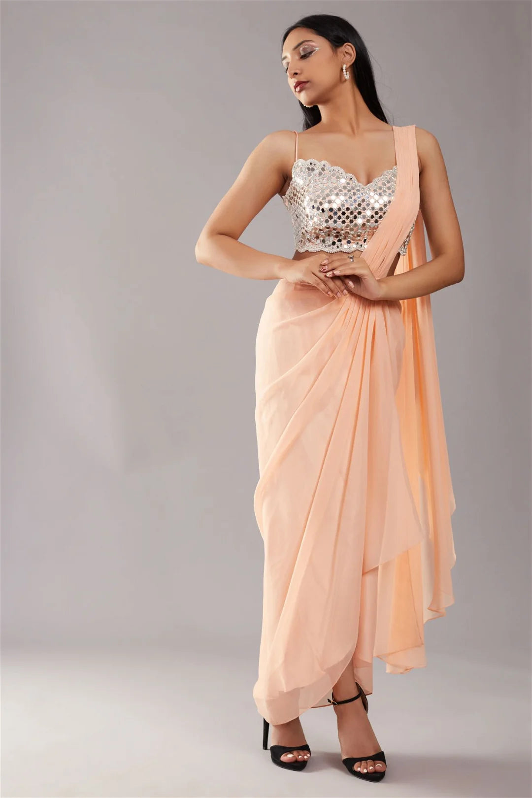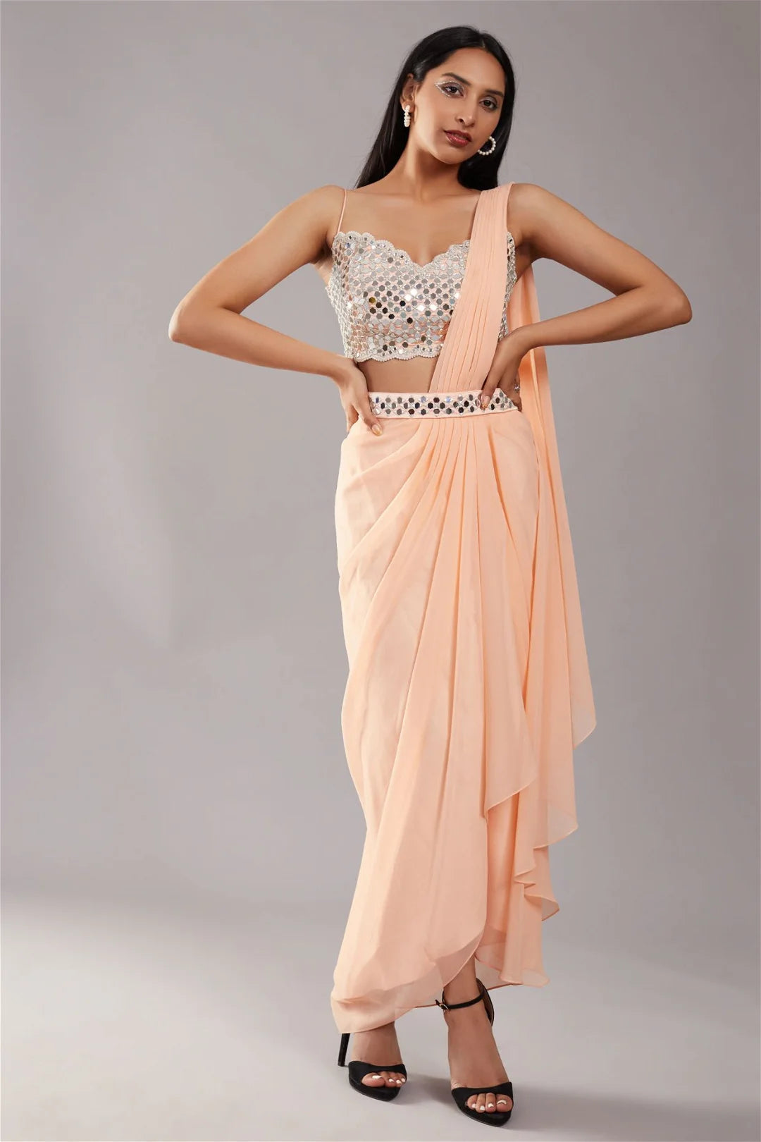 Peach draped saree paired with mirror & pearl embroidered sleeveless scallop blouse. Comes with mirror embellished belt.