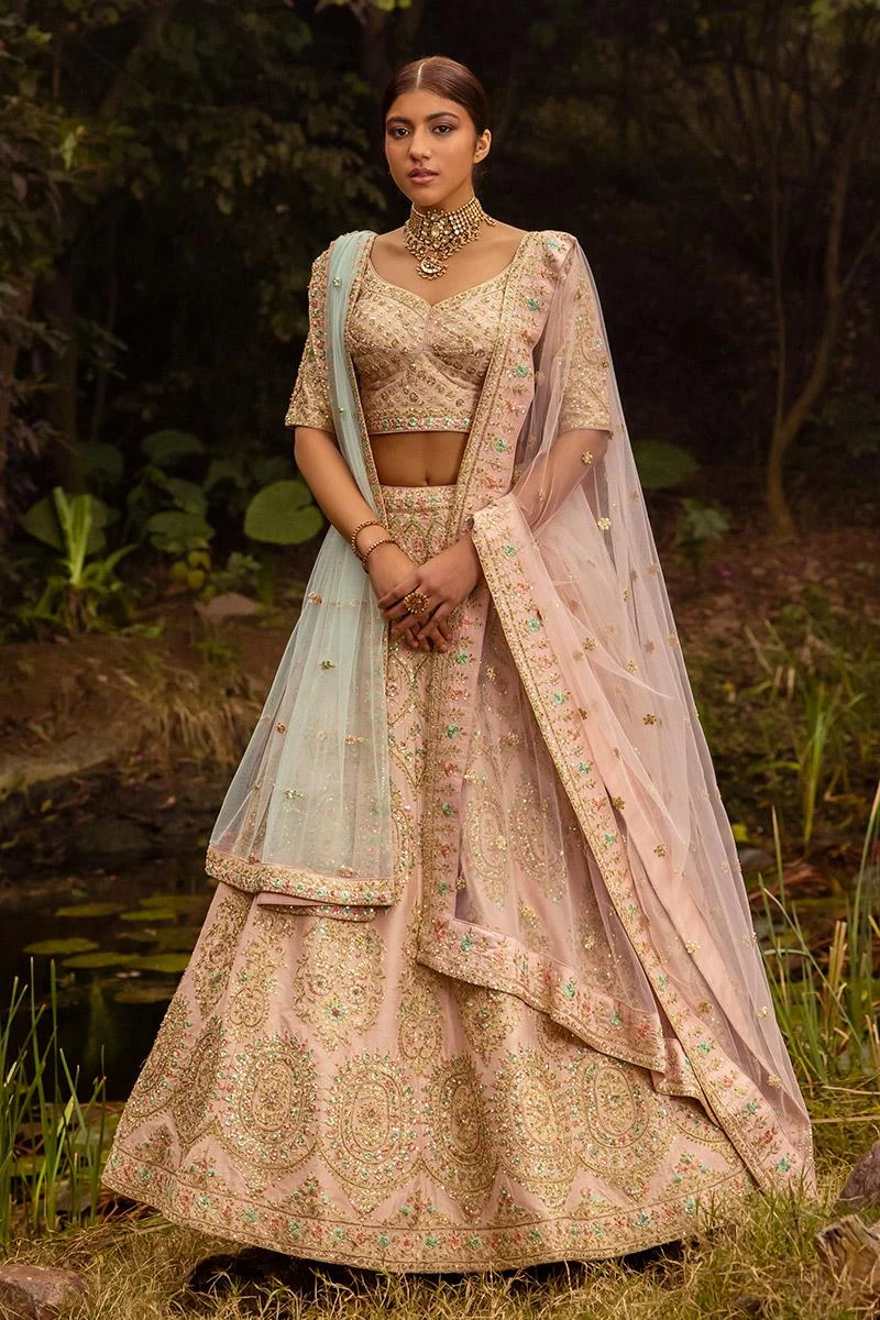 Peach raw silk lehenga intricately hand embroidered with silk threads, dabka, sequins and cutdana using the traditional zardozi technique. Paired with an embroidered blouse, net two dupattas.