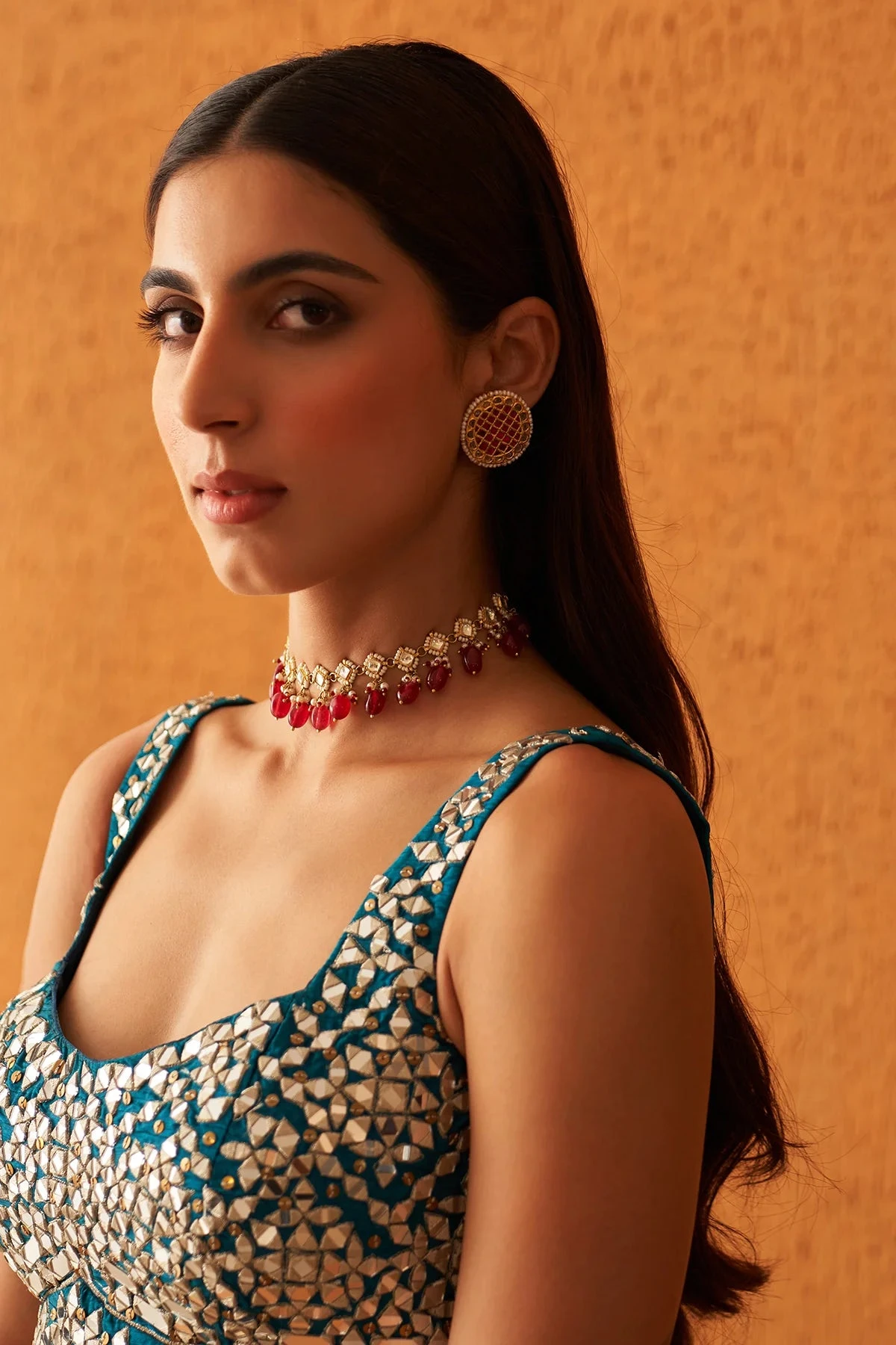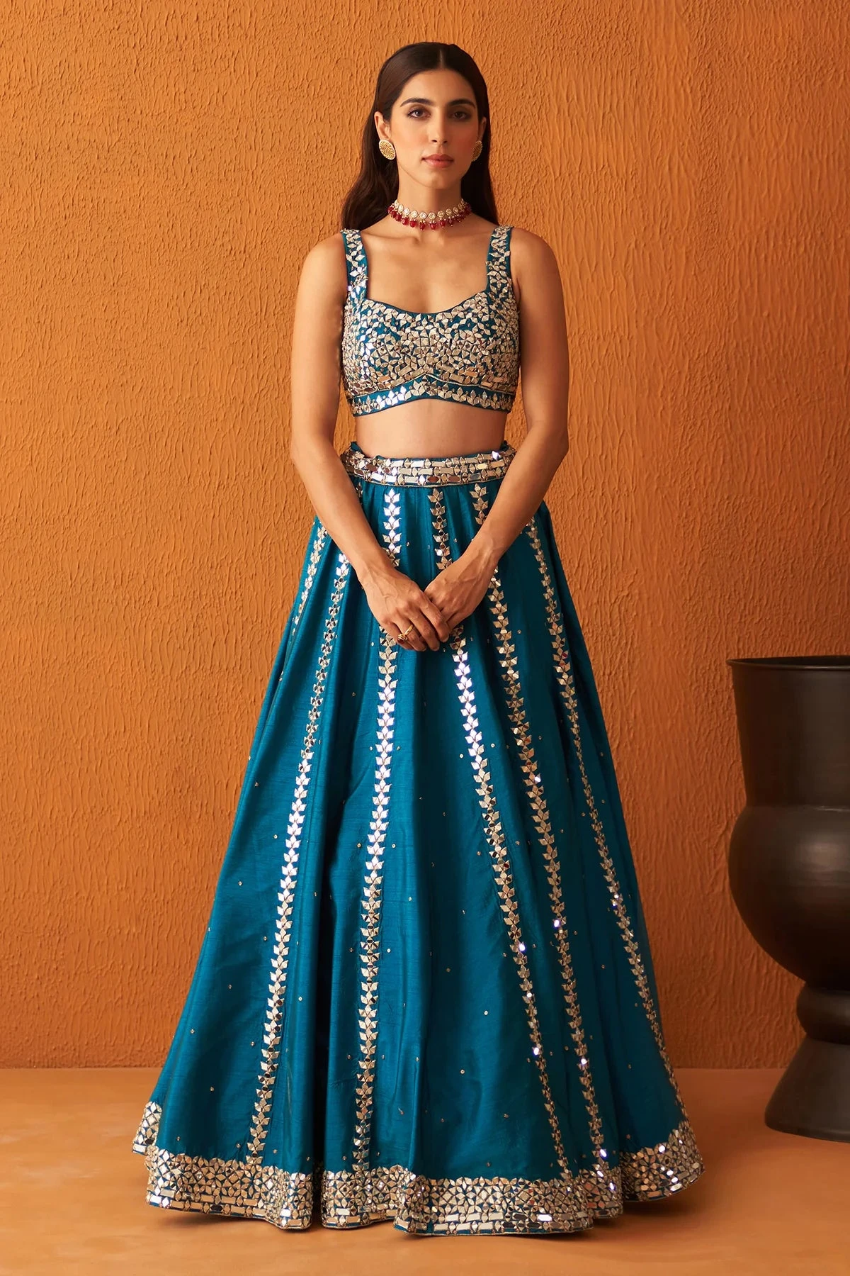 A peacock blue raw silk lehenga set embroidered with metallic sequins and mirror work encrusted with water gold zari.