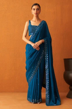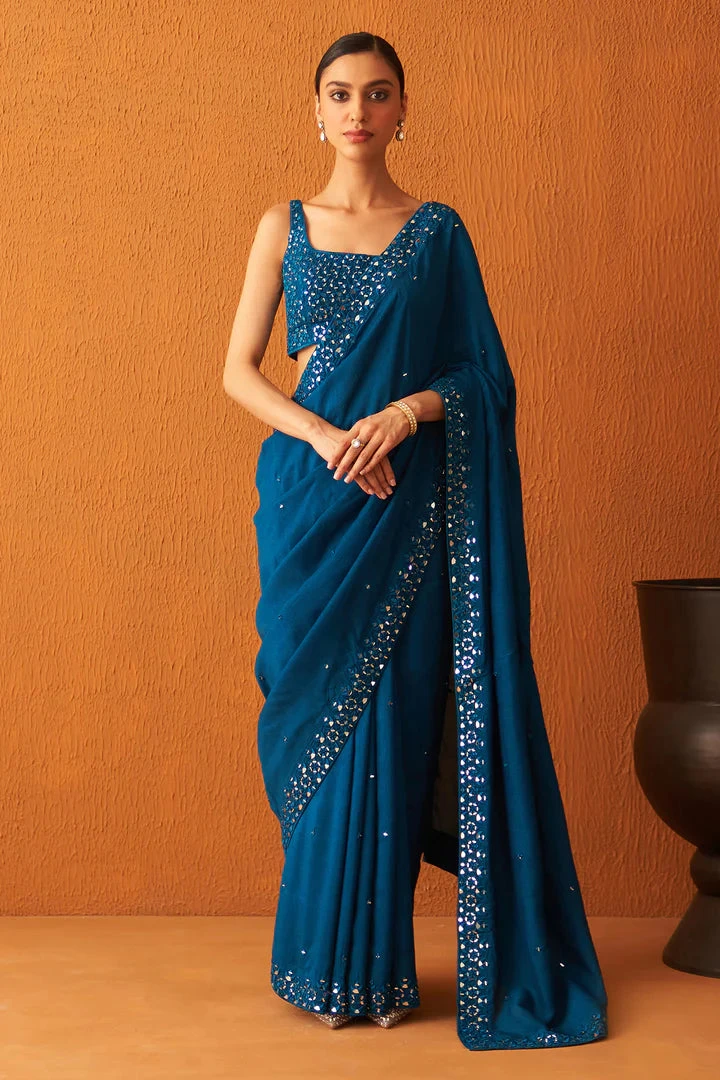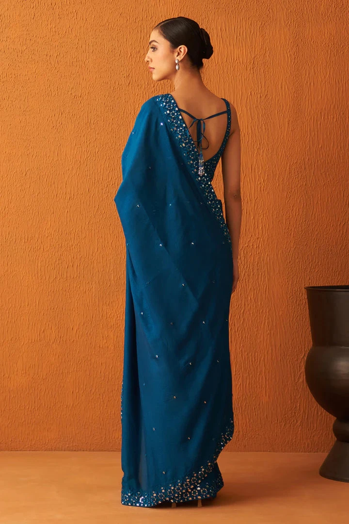A peacock blue silk saree embroidered mirror work encrusted with tonal silken threads.