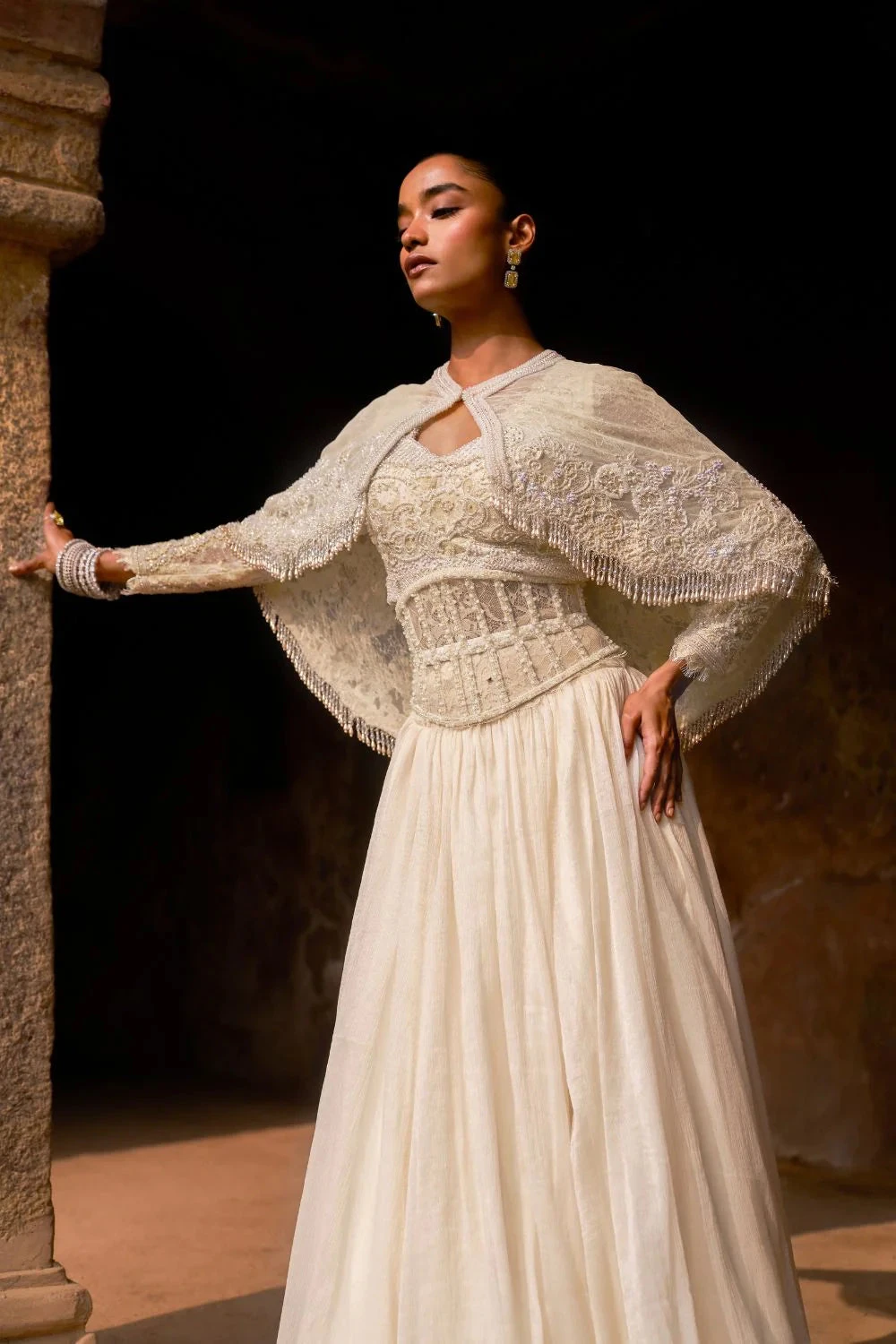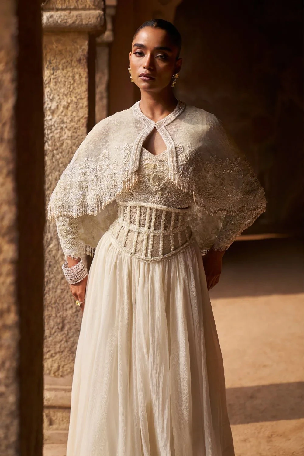 Fabric: Skirt: Crushed satin organza / Blouse: Chantilly lace / Cape- Chantilly lace