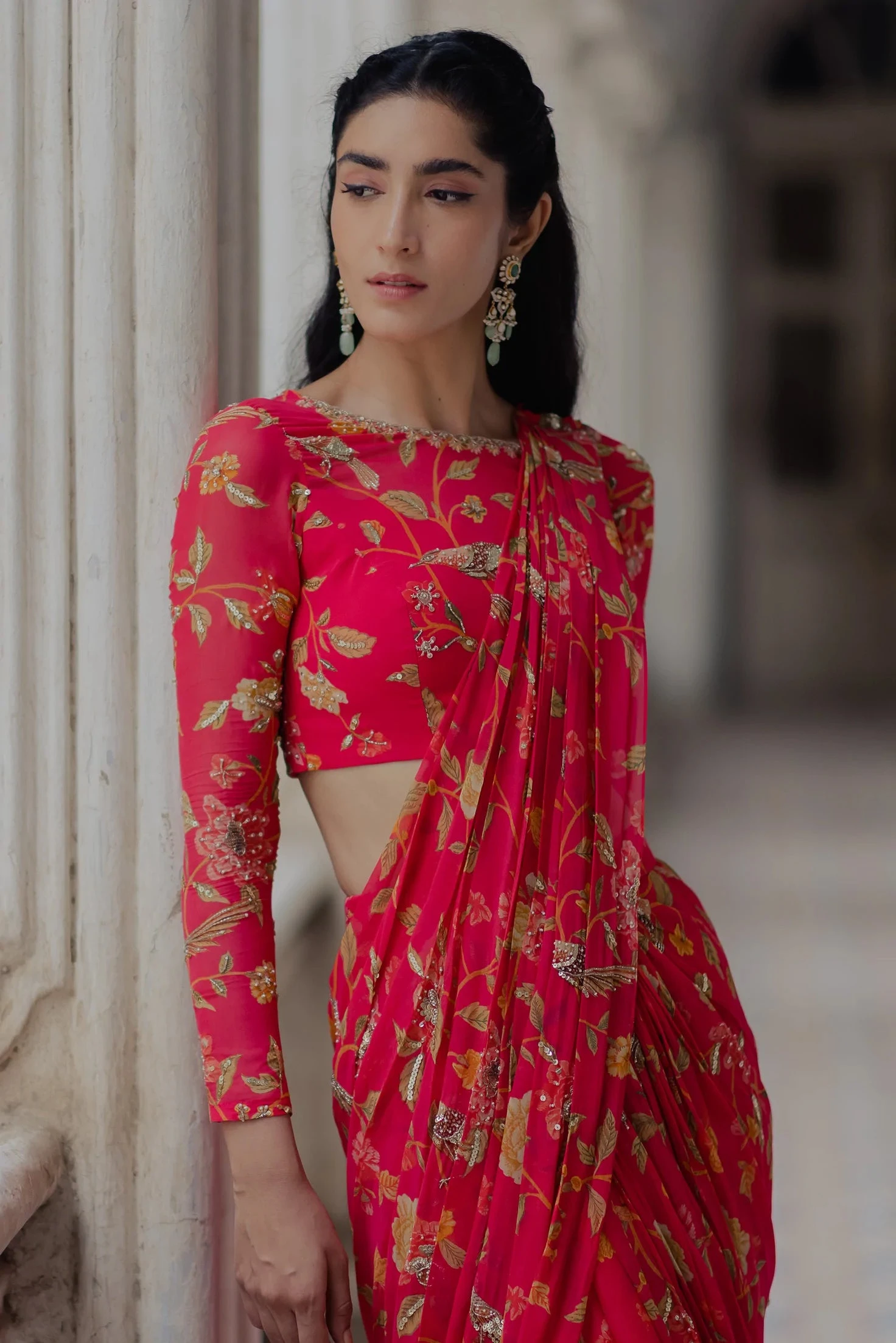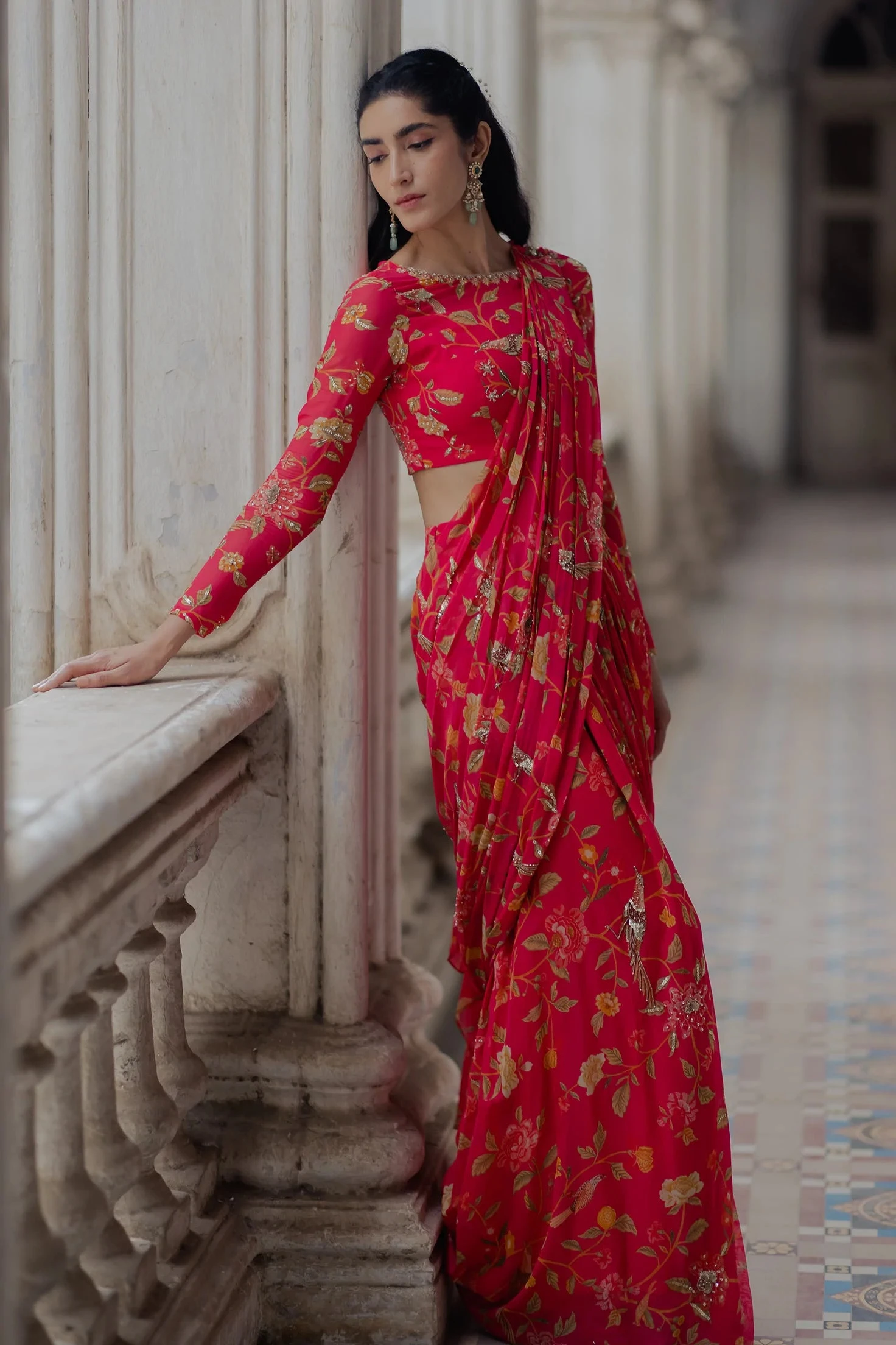 Floral printed pre–stitched saree in the shade of peony pink. It is crafted from georgette and the and the pallu are hand highlighted with cutdana, moti and sequins.