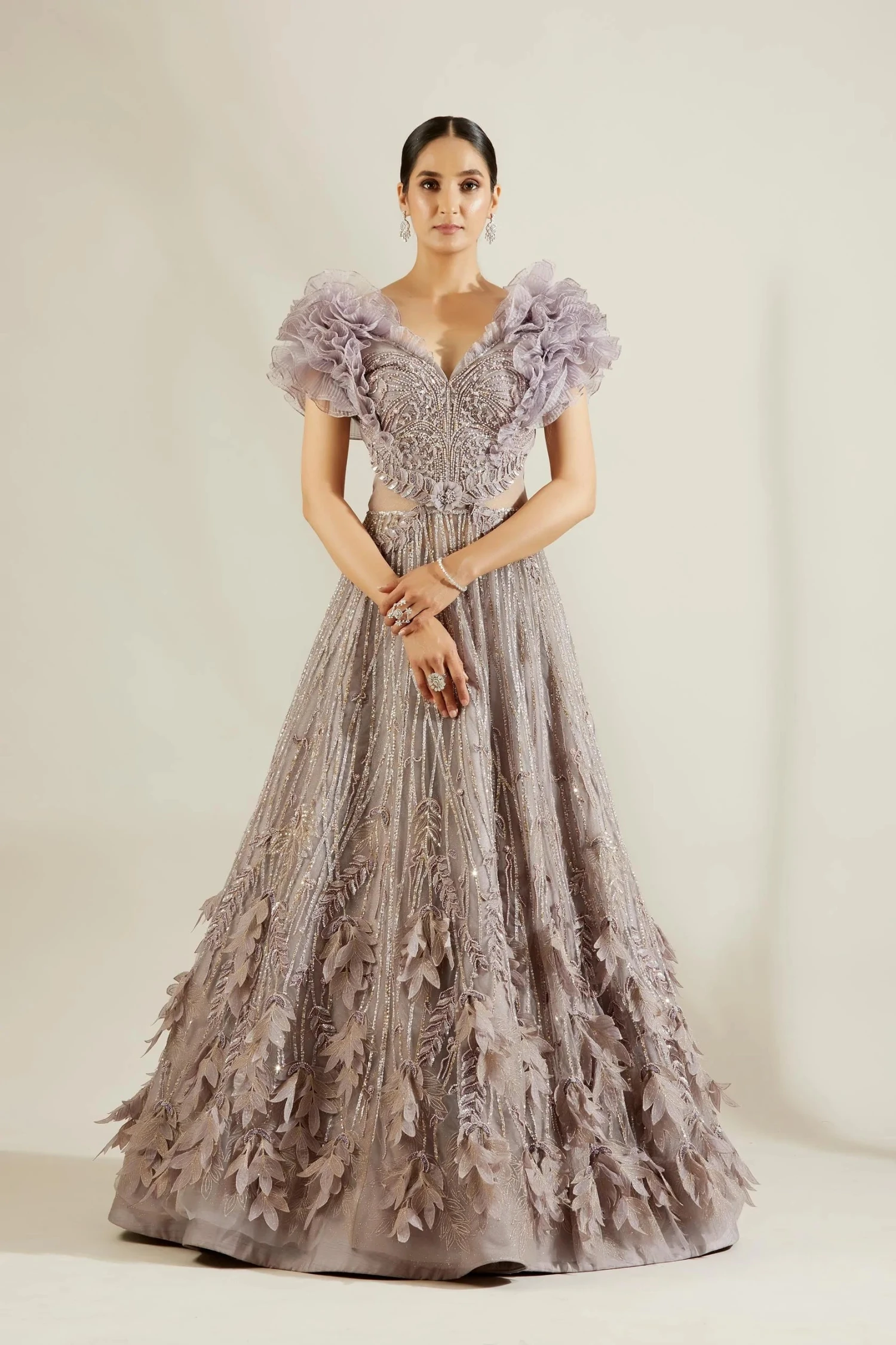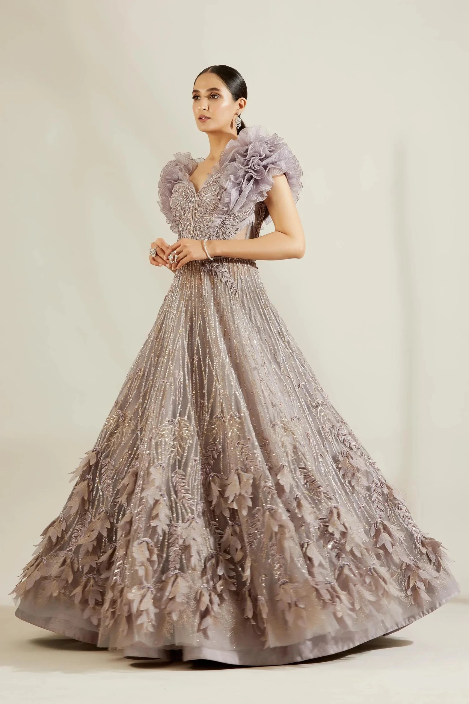 Mauve flared gown with voluminous organza ruffled sleeves, 3D applique leaf motifs on flare & brush stoke patterned embroidery.