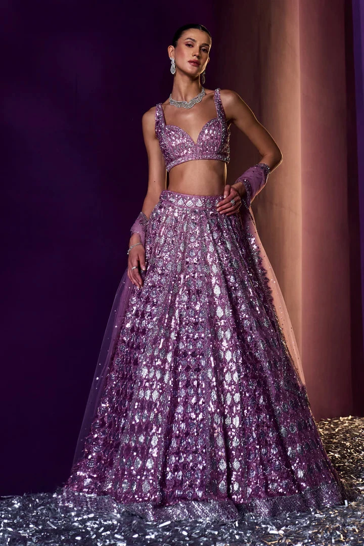 Periwinkle organza lehenga set embroidered with tonal & silver sequins, crystals and bugle beads.