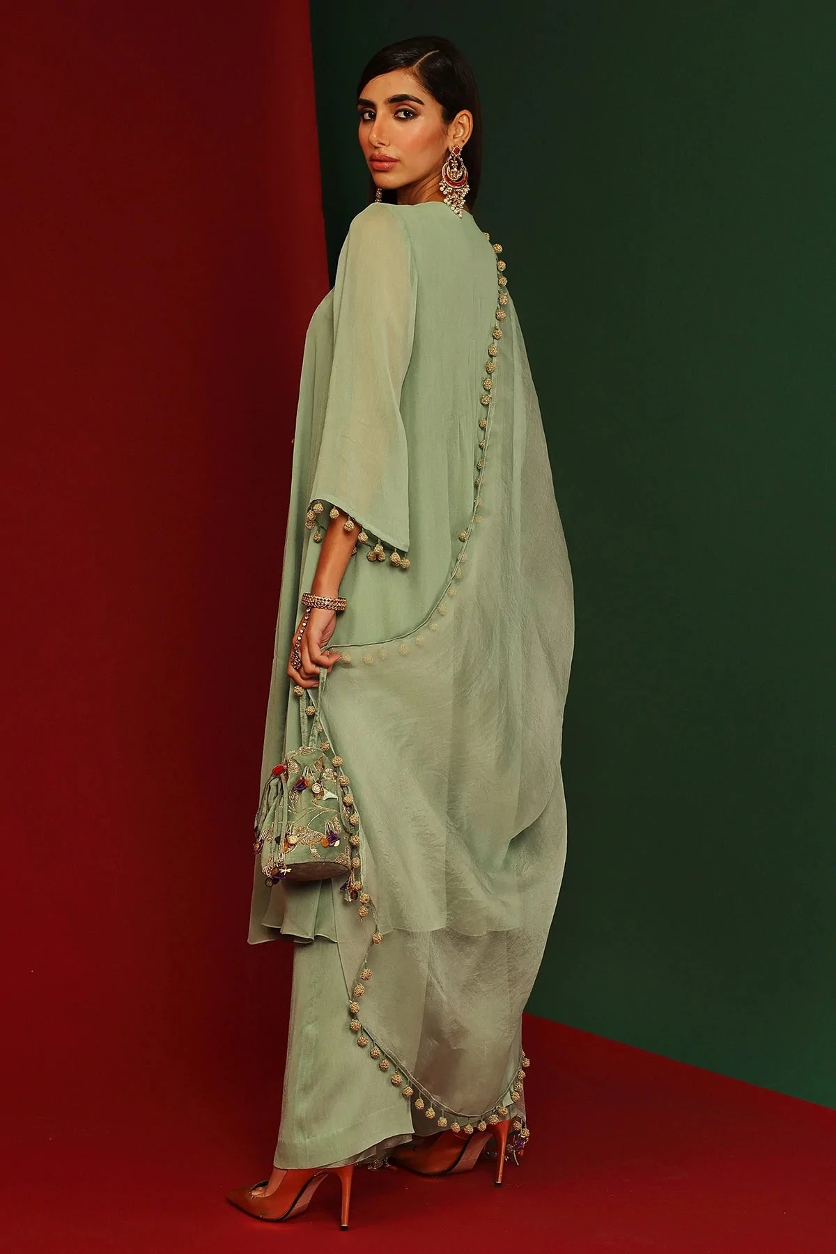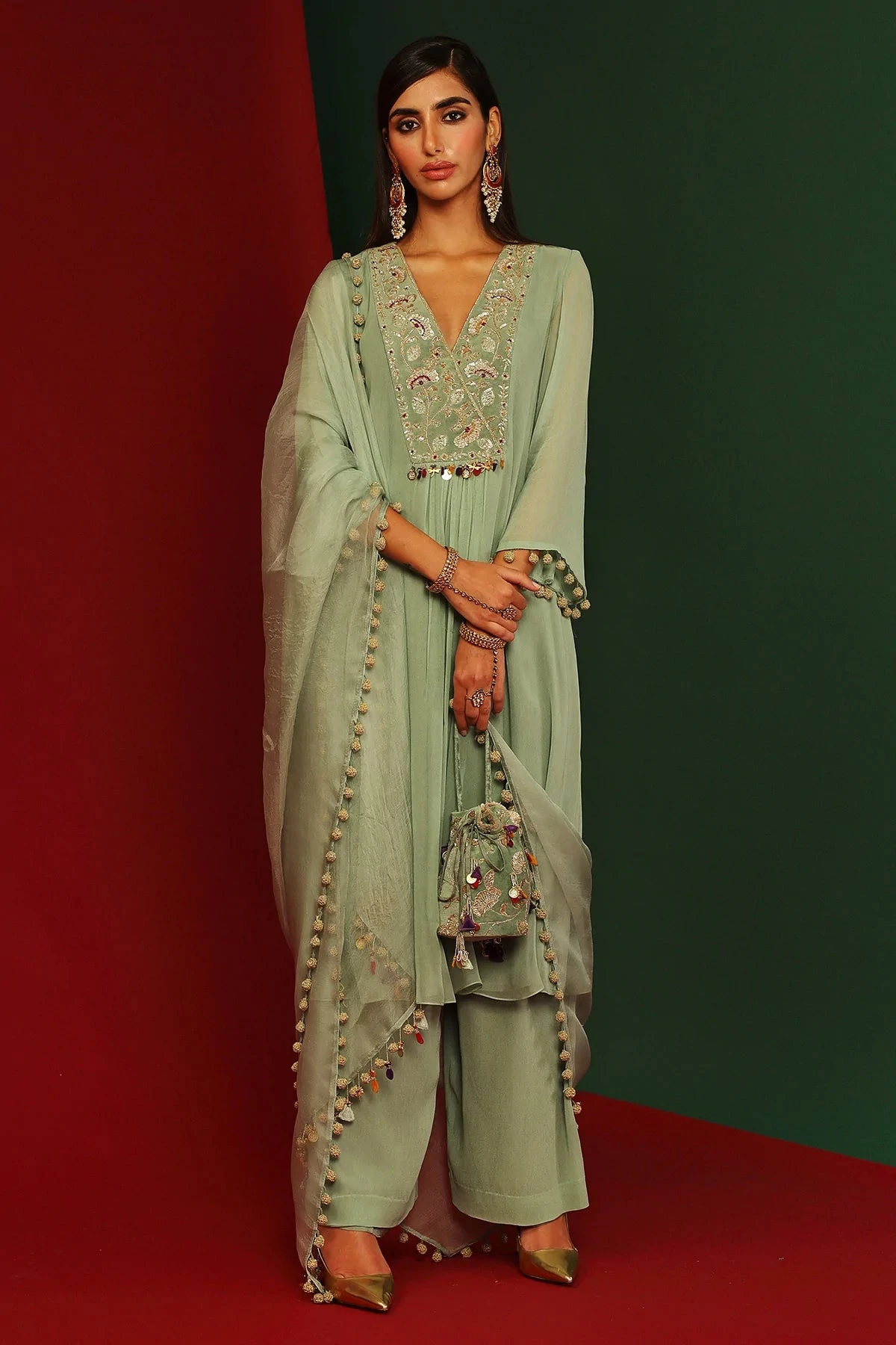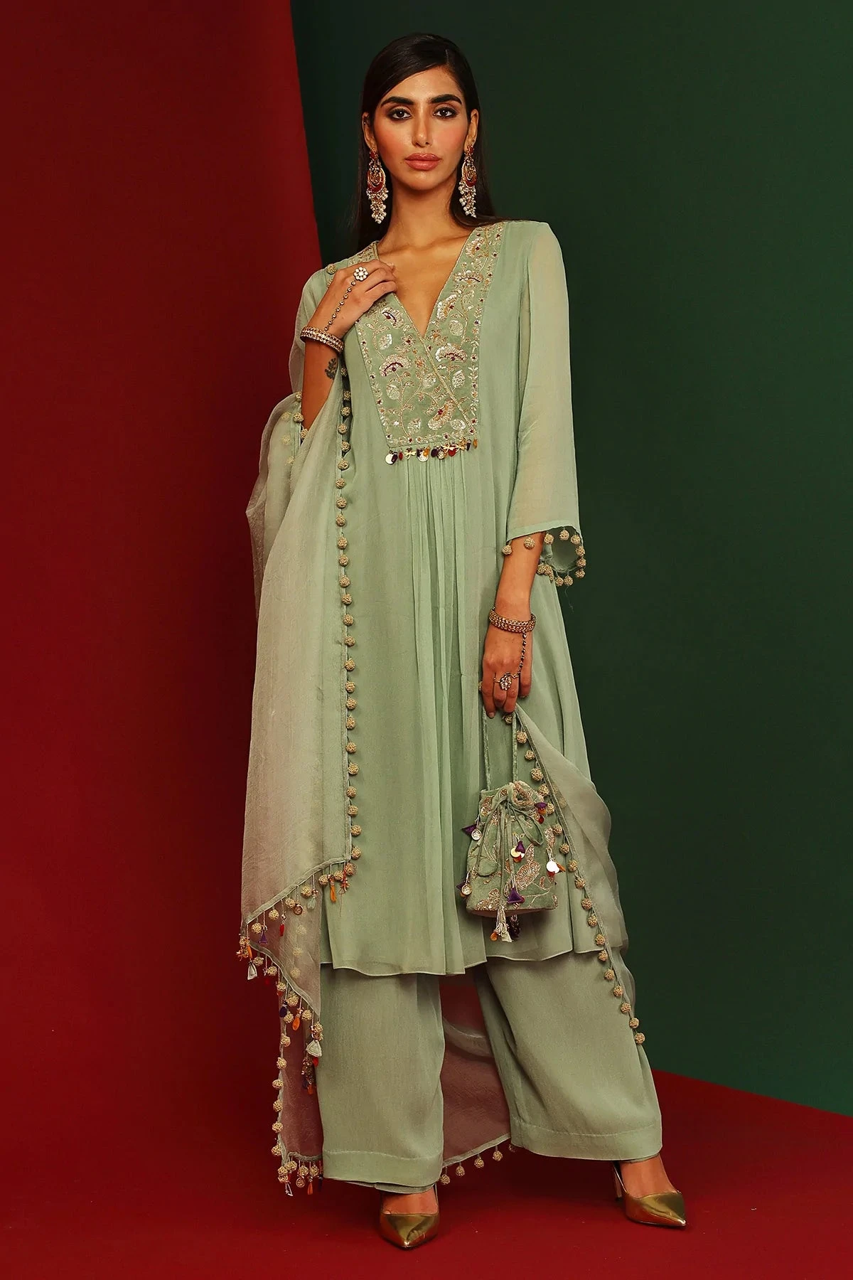 Jade embroidered Kurta in georgette, pants in georgette and organza dupatta with hand made tassels