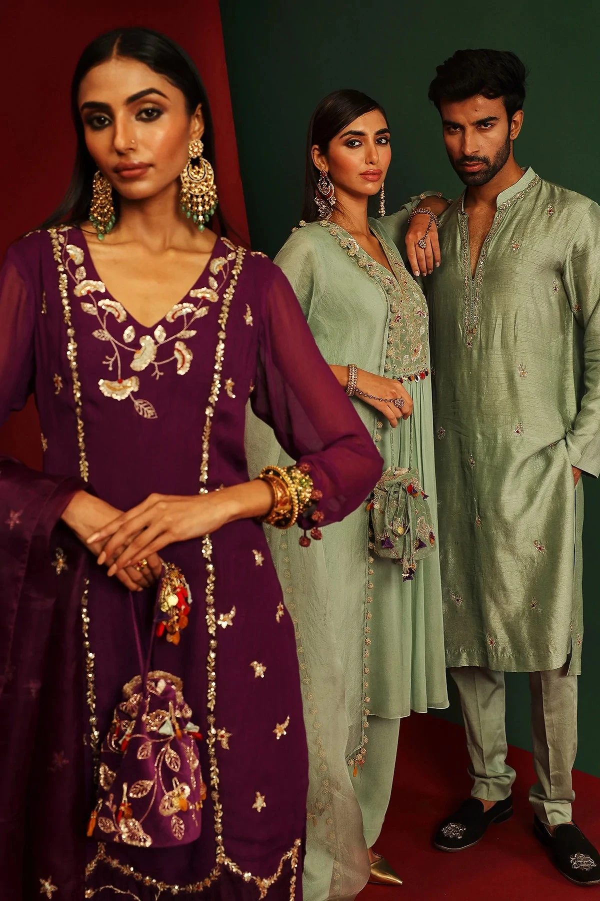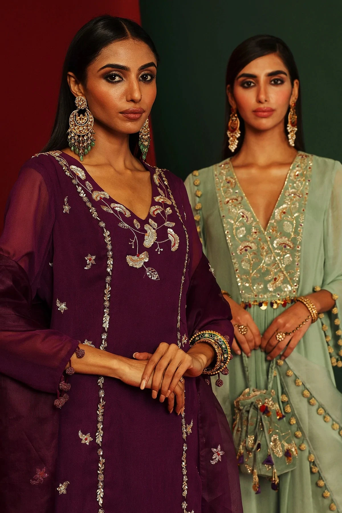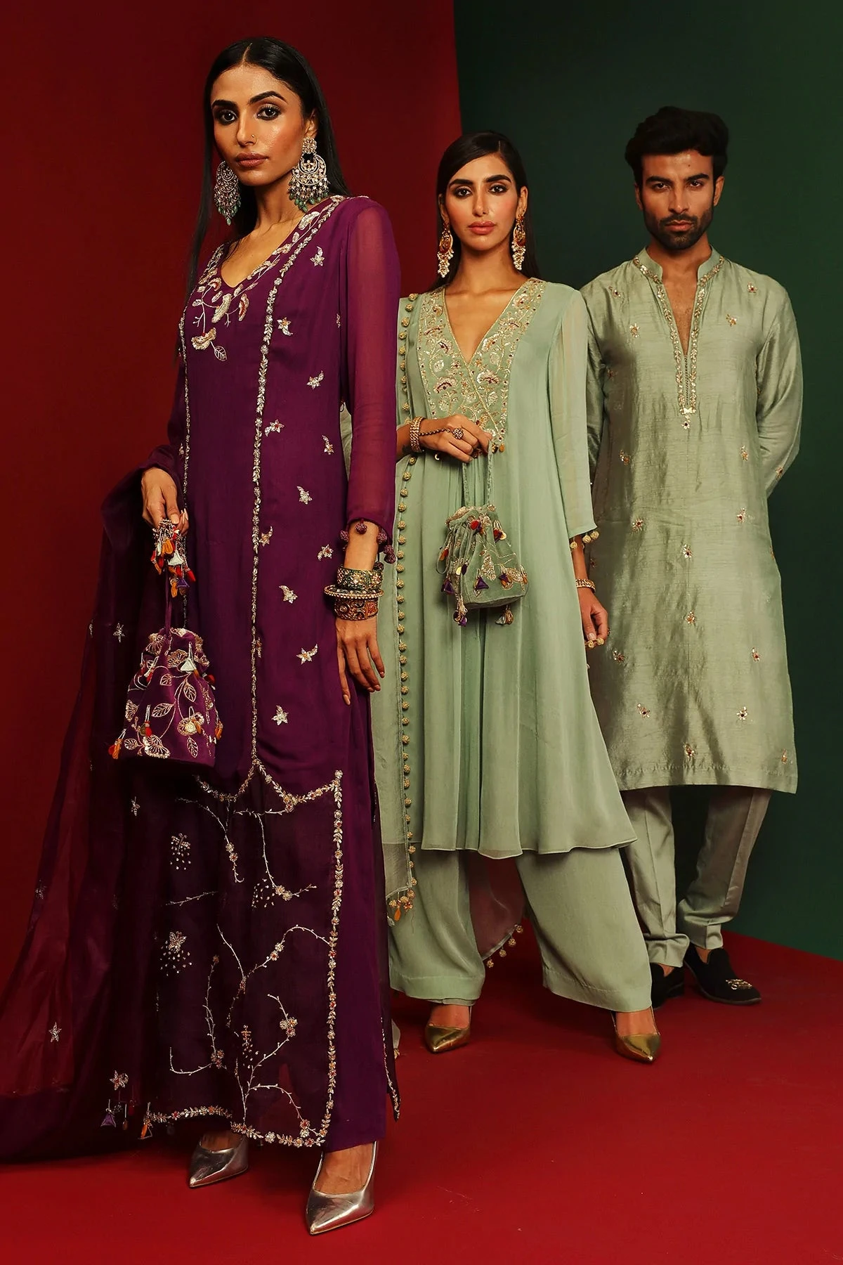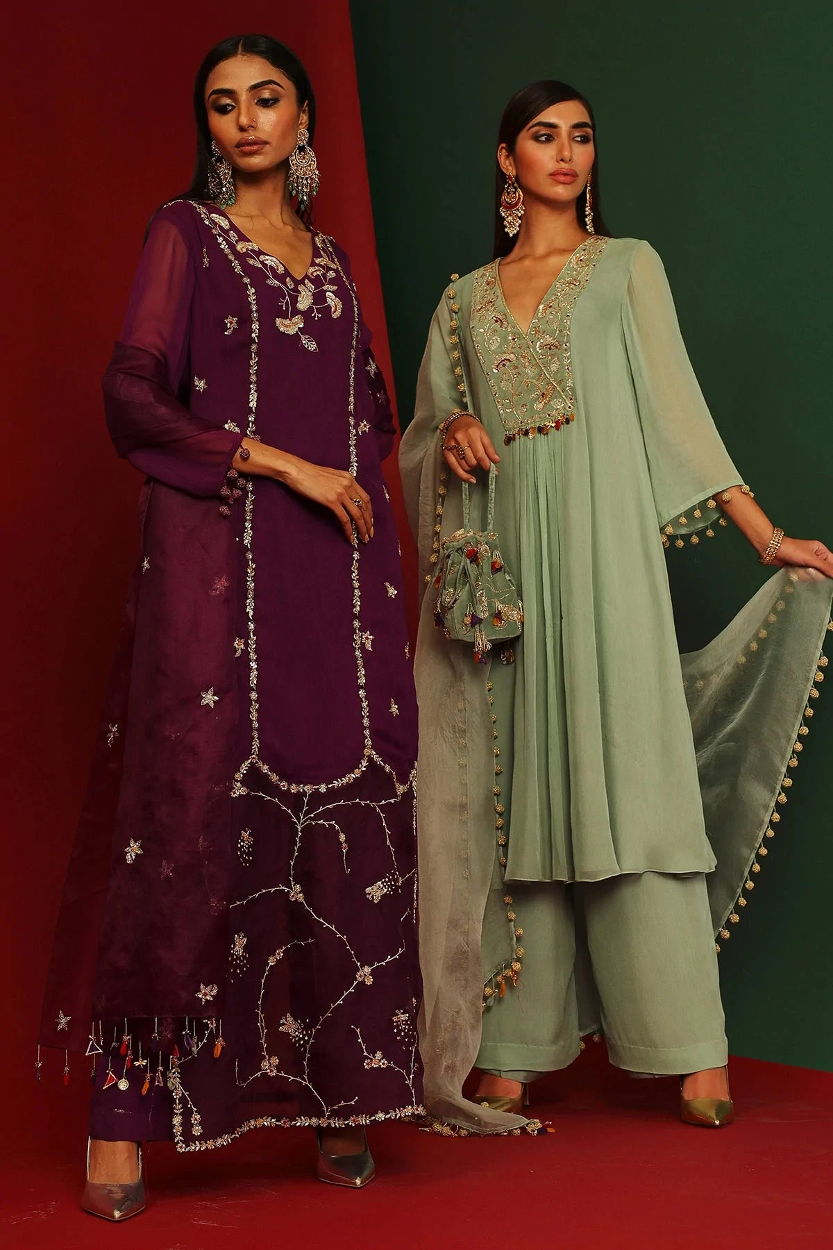 Jade embroidered Kurta in georgette, pants in georgette and organza dupatta with hand made tassels
