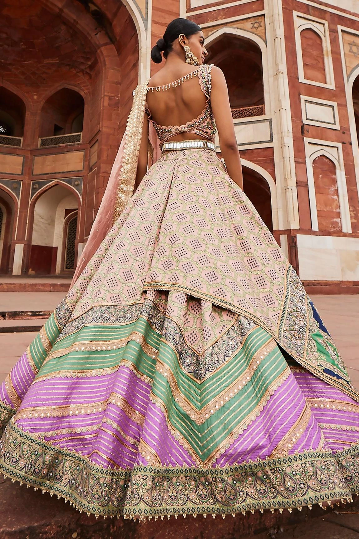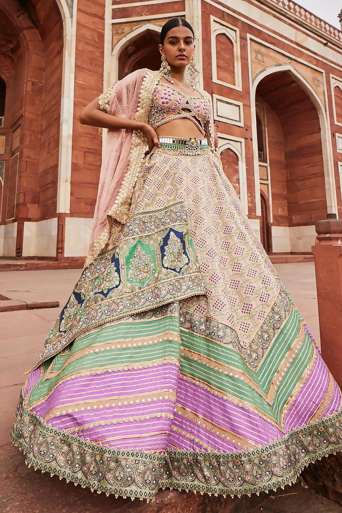 Powder pink A-line flare lehenga, crafted in banarasi base with all over bandhani embroidery, zardozi embellishments, & contrast broad chevron panels with stripe pattern. Paired with a padded, scallop trim blouse with floral butti embroidery. Comes along with an embroidered dupatta and belt.