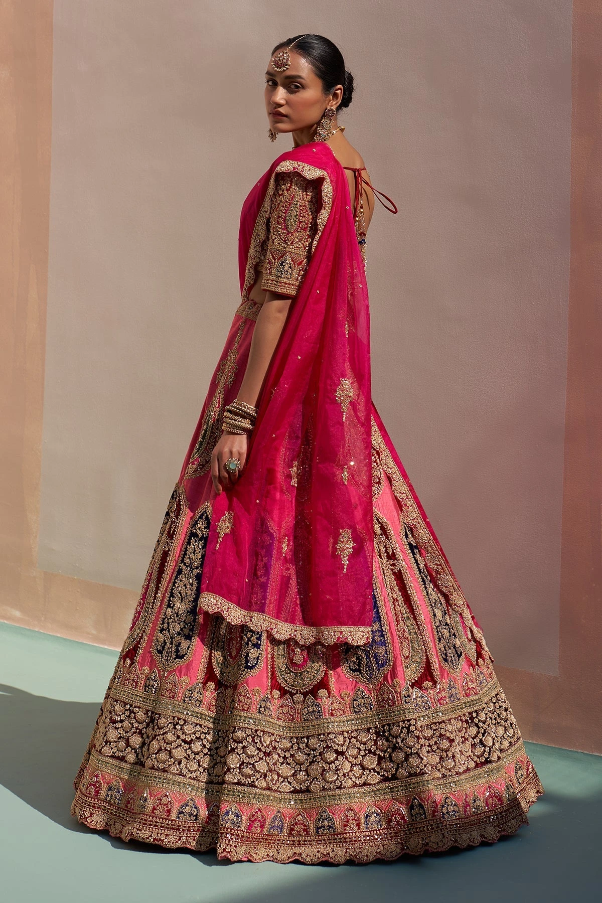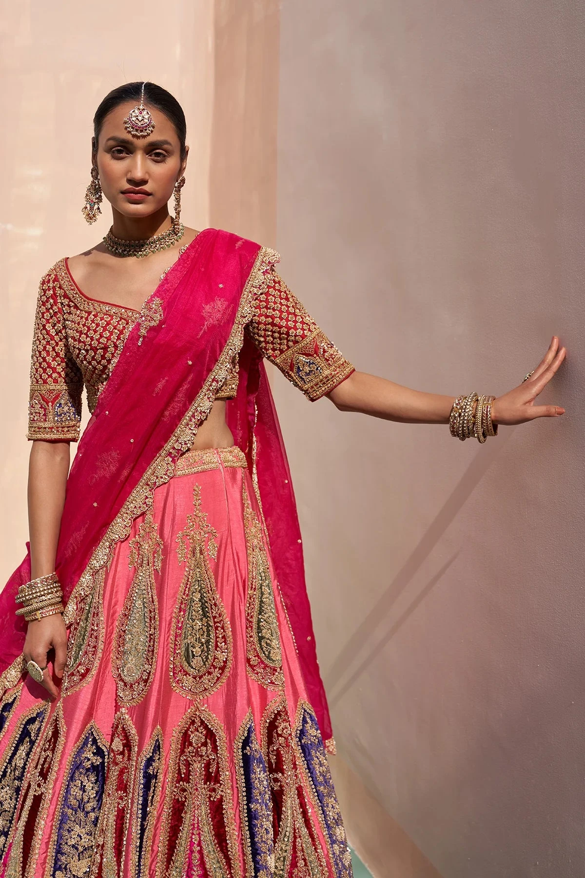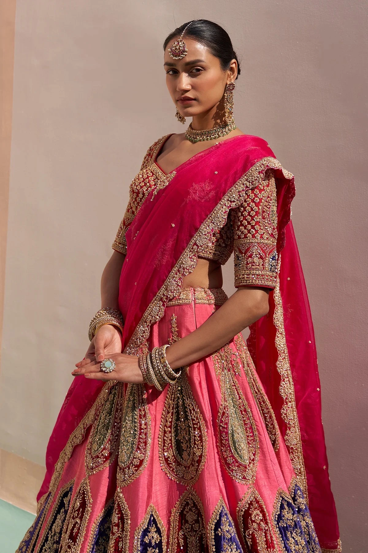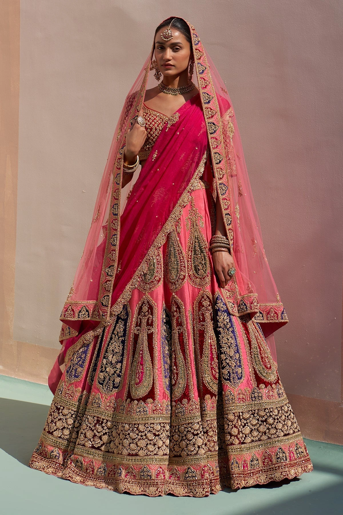 A pink double dupatta lehenga set embroidered with the traditional zardozi technique using silken threads, dabka, cutdana and sequins underlayered with multi colored velvet appliques.