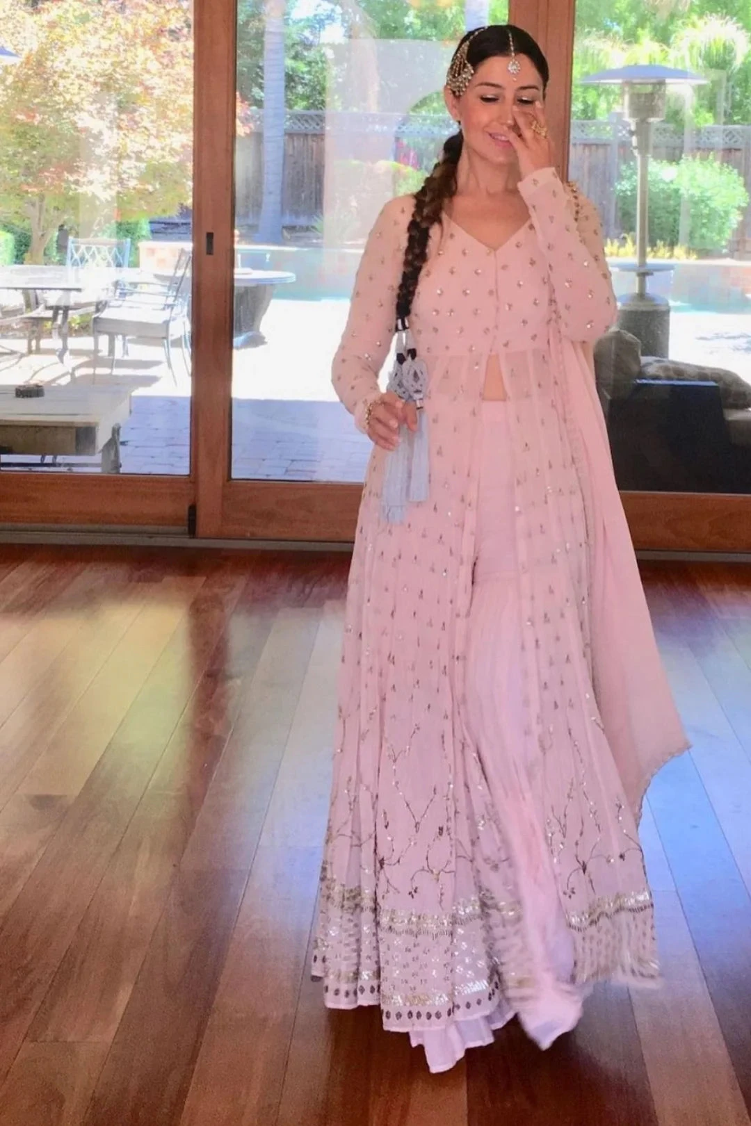 Pink Front Open Anarkali Set With Pants And Dupatta.