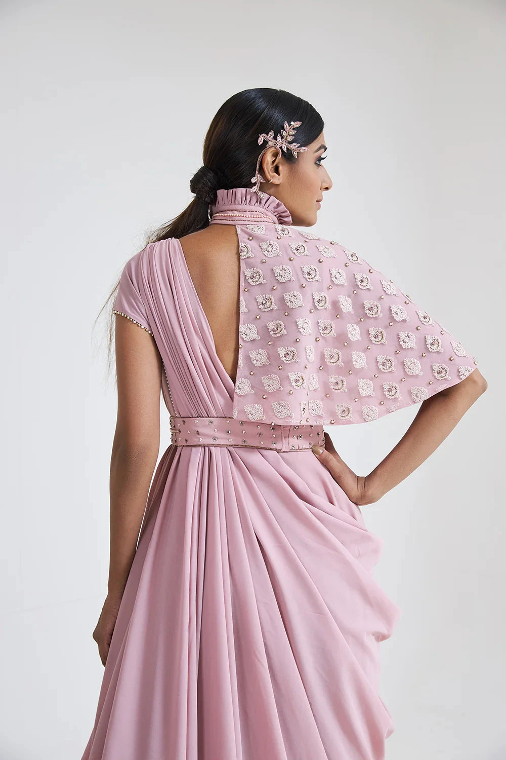 Pink Pre-drape Saree Comes With Detachable Belt And One-sided Cape Collar.