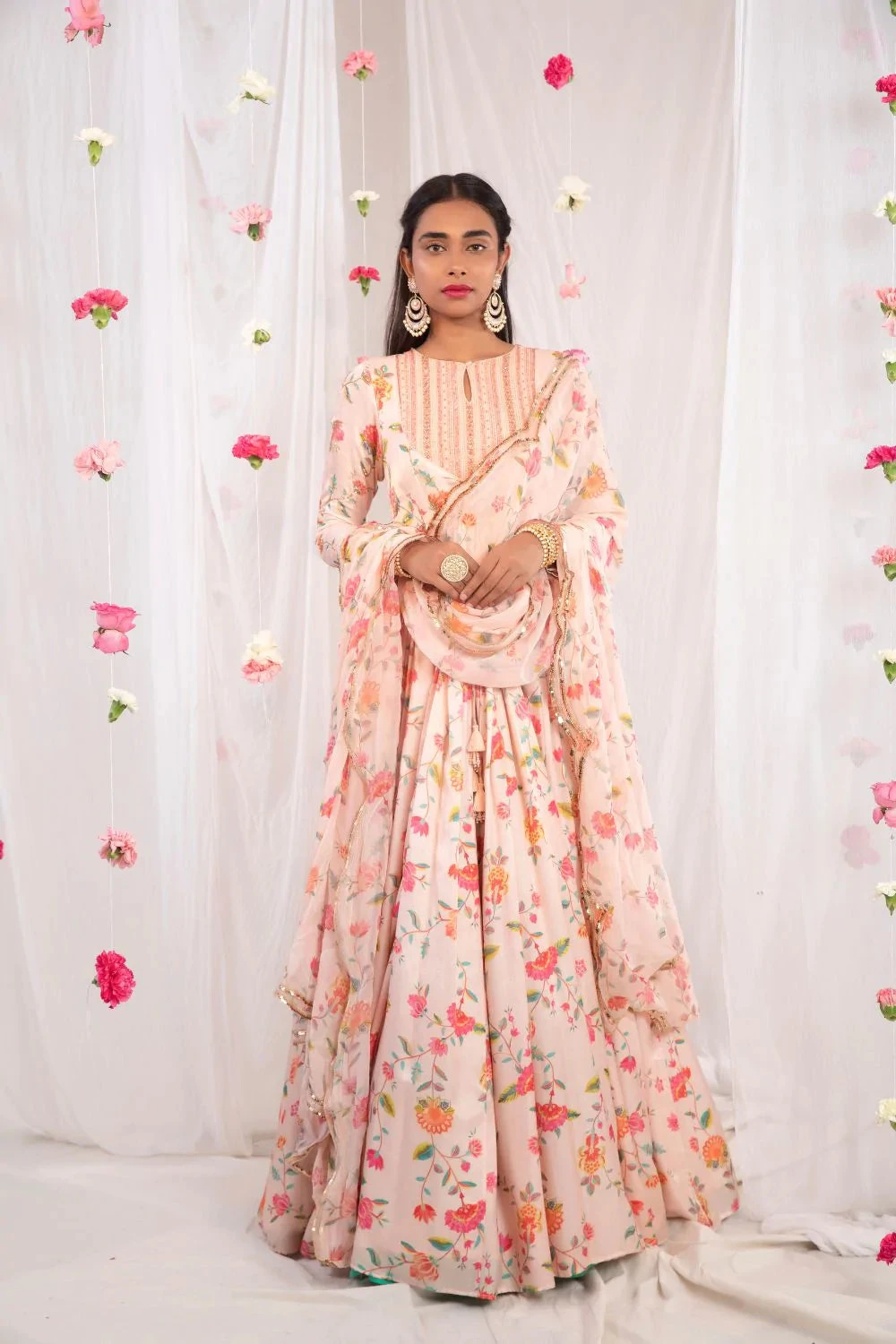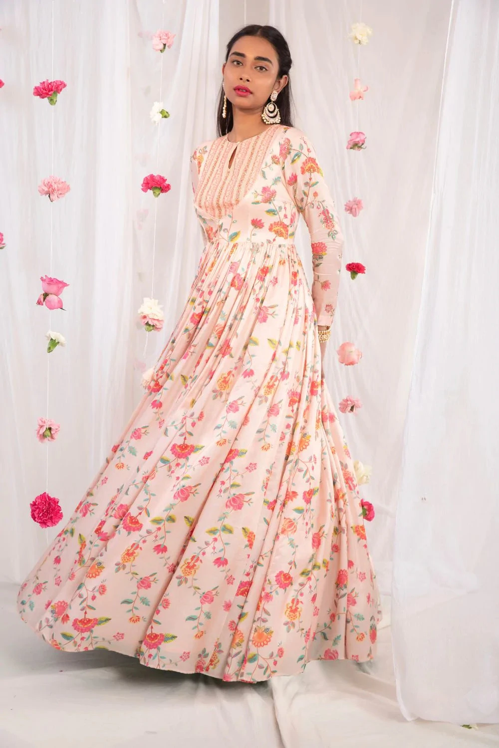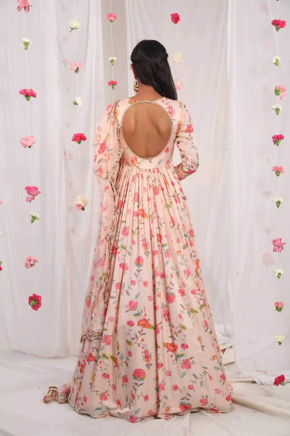 Pink jacket Anarkali in gajji satin base with floral printed motifs, embellished with cutdana & sequins. Paired with a printed dupatta with a sequin border.