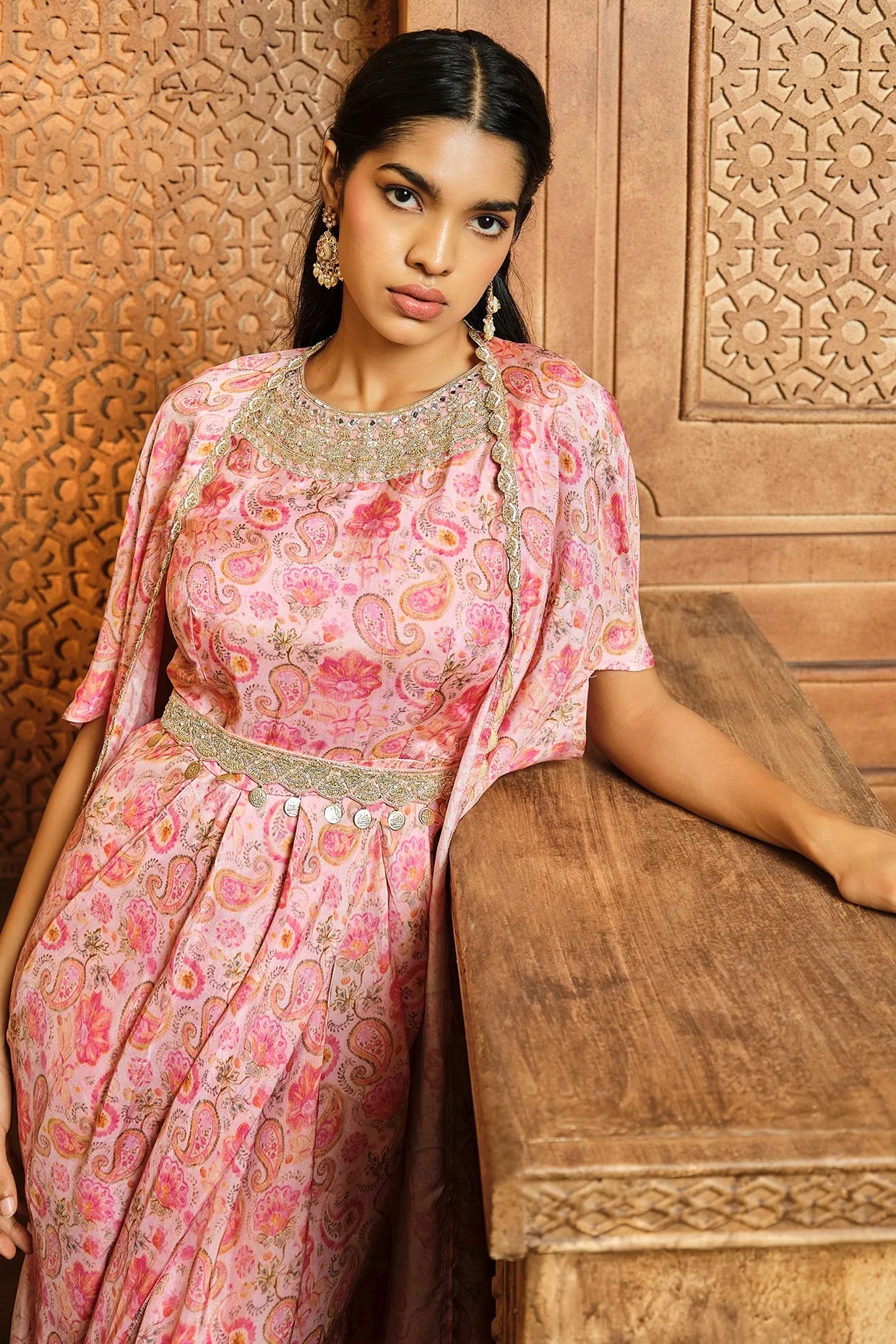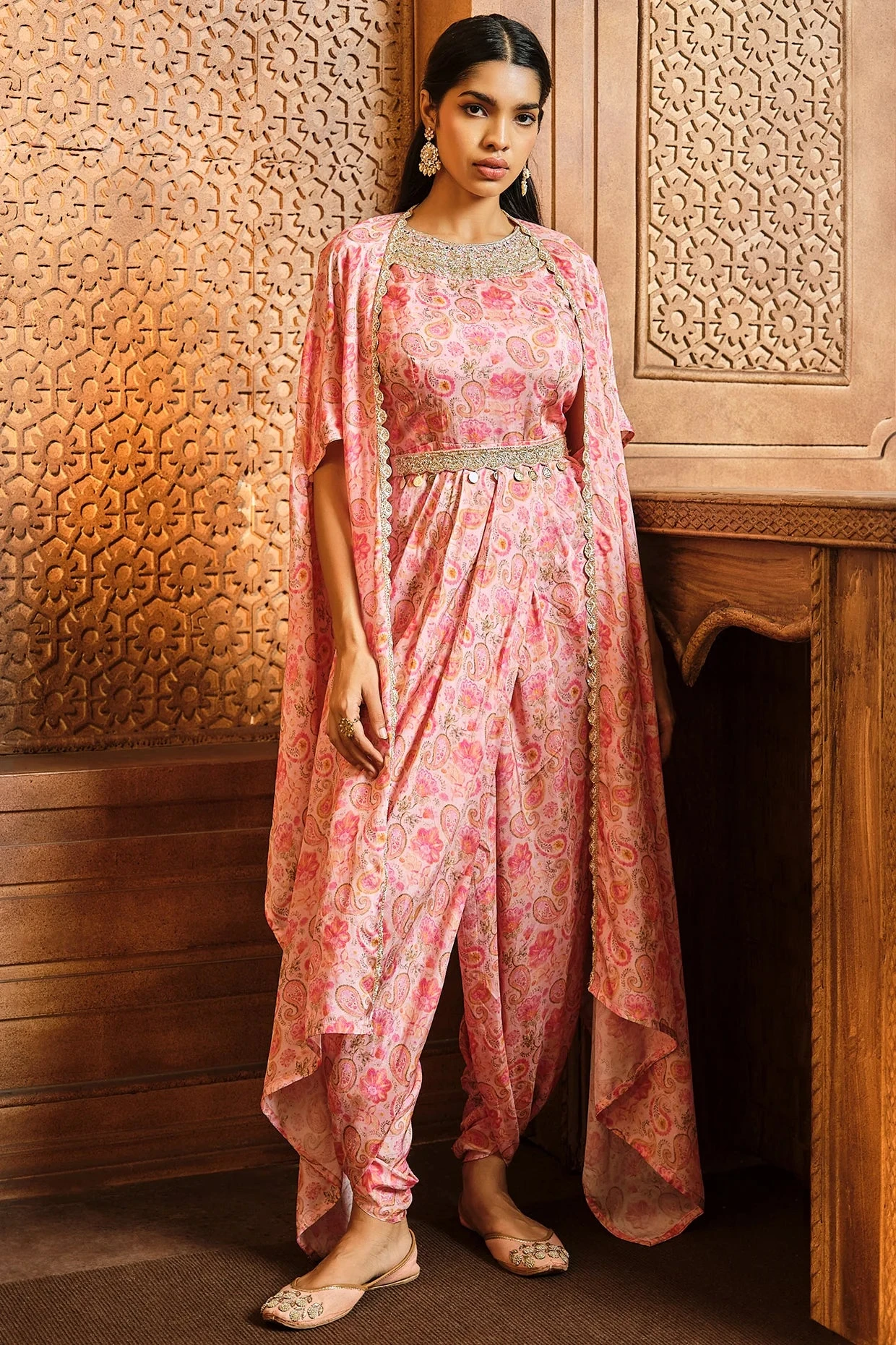 Featuring A Pink Paisley Habudai Cowl Jumpsuit With Zardosi Embroidered Neckline And Belt. It Has A Hi-Low Cape Jacket With Front Border To Finish The Look.