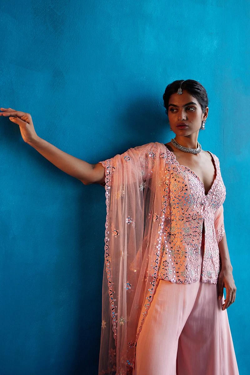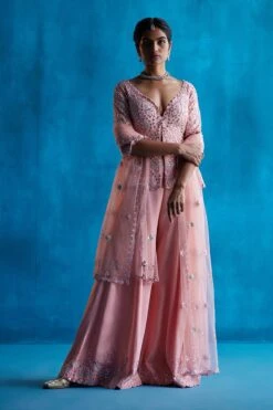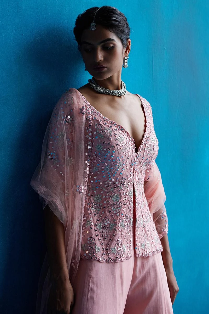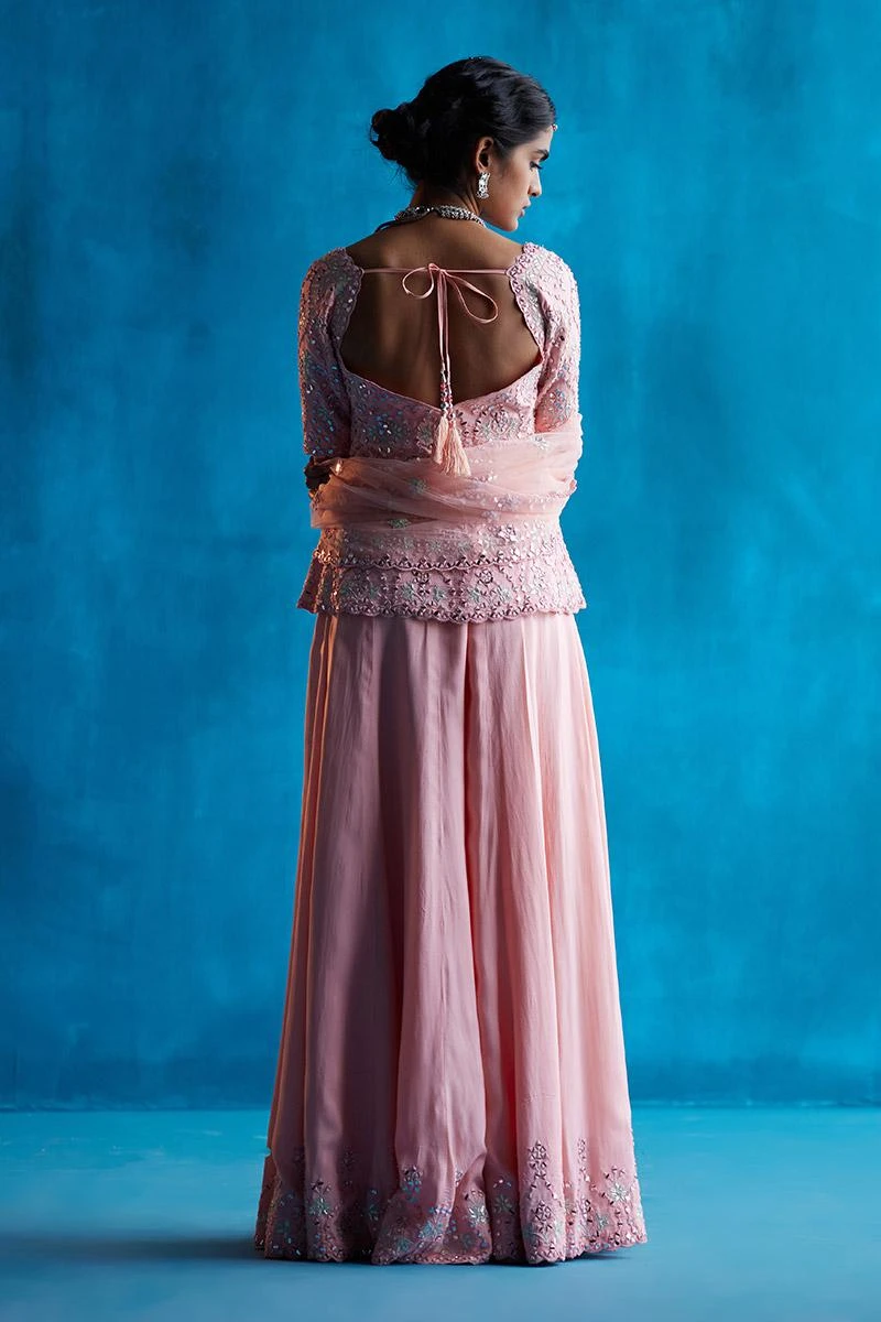 Pink peplum style top with all-over mirror, thread embroidery and slit in front. Comes with a sharara and net dupatta.