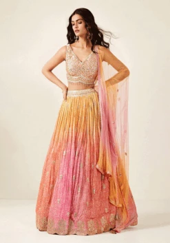 Say ‘yes’ to sorbet tones with this tie-dye, printed lehenga set featuring a burst of colour! Featuring an embroidered border on the lehenga and a pastel blouse with cutdana, resham and mirrorwork, it is a surefire Mehendi chartbuster. Also comprising a tie-dye dupatta with mirror buties.