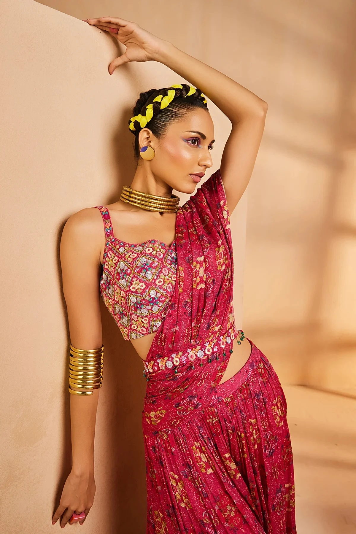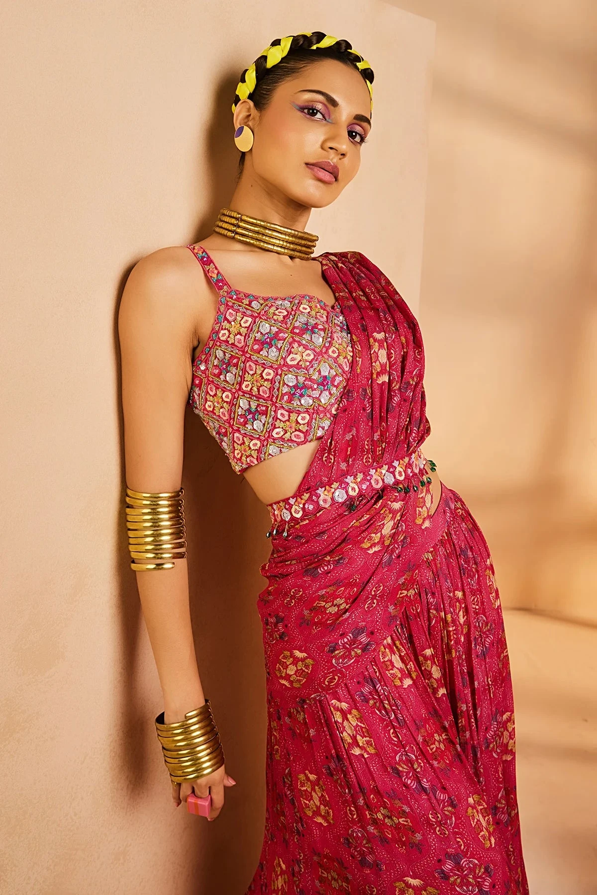 Featuring a Kalidar pre-stitched sharara sari featuring a hand painted Indian botanical print. The blouse and belt and fully hand embroidered with colourful beads and sequences.
