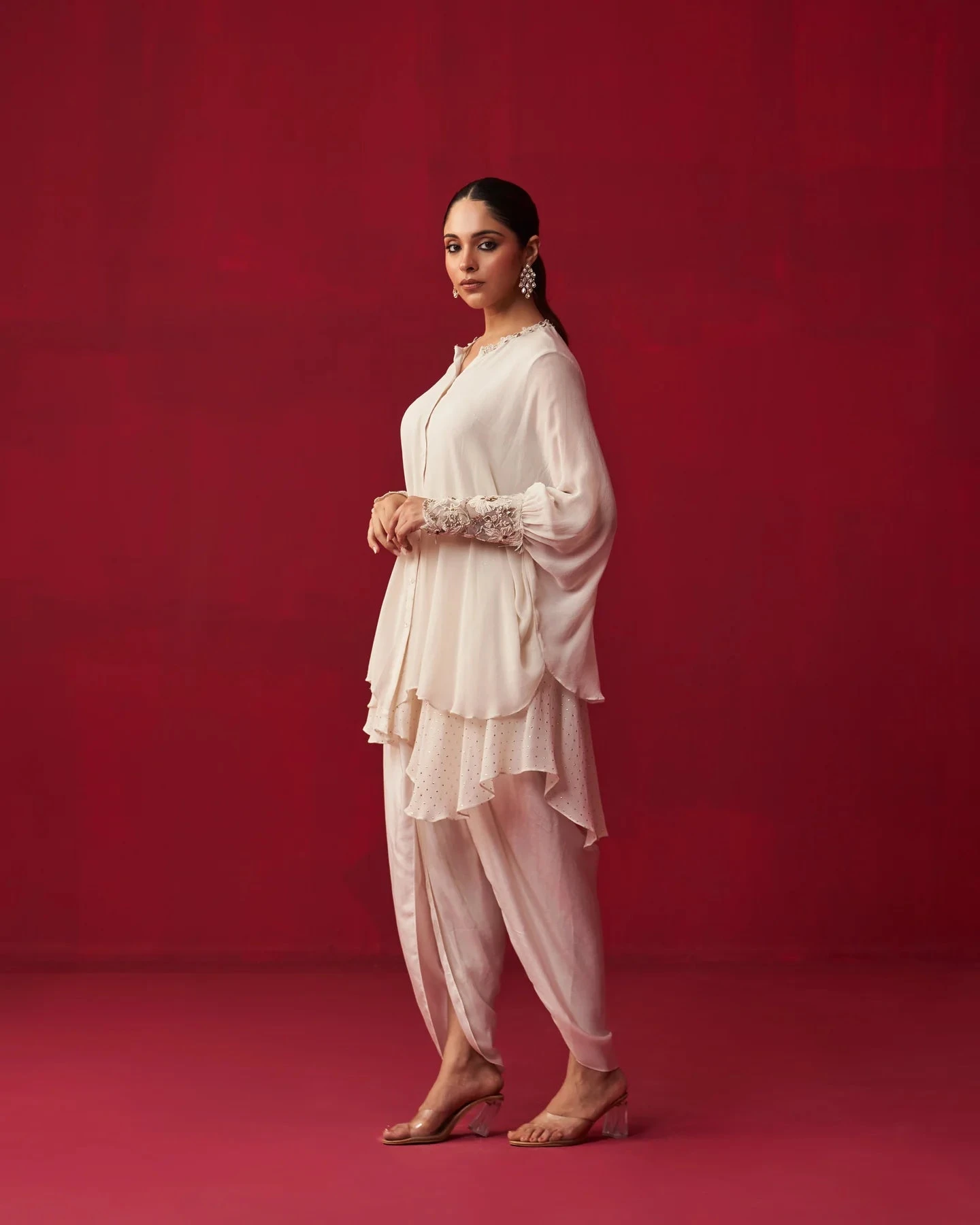 Ivory georgette layered top with pixelated floral embroidered bodice, paired with dhoti