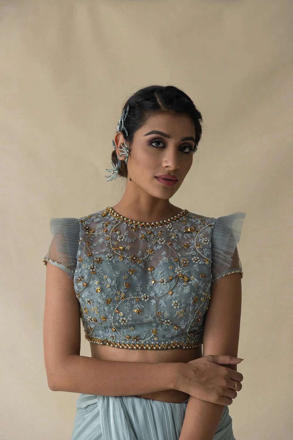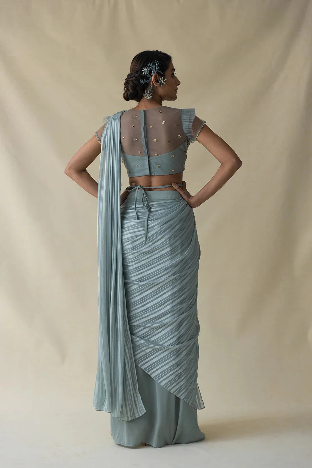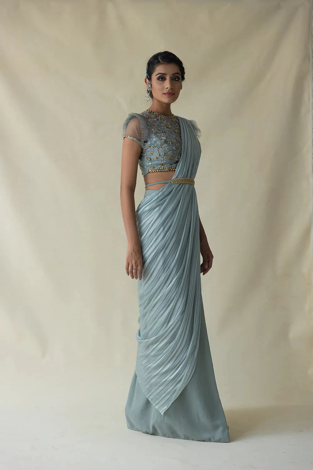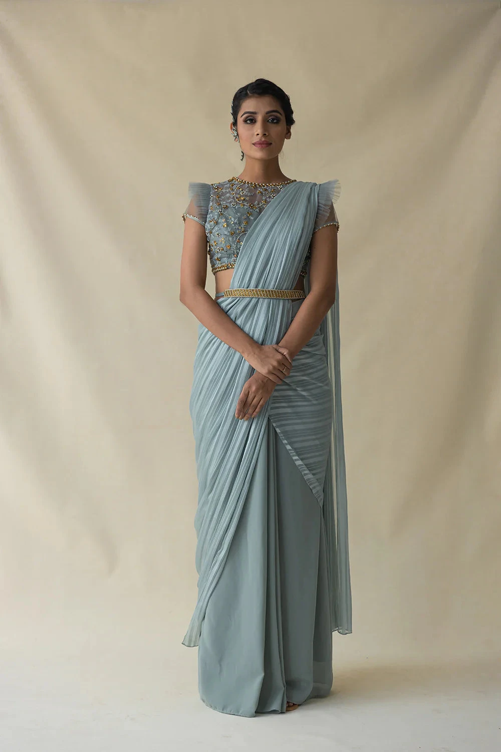 Powder Blue Pre-drape Saree Comes With Embroidered Pleated Sleeve Blouse And Detachable Belt.