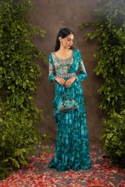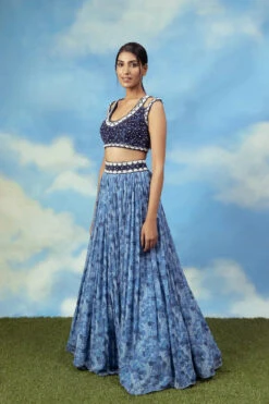 Blue Floral Printed Georgette Garara Set With Gota Patti Combined With Sequins, Pearl And Dori Work