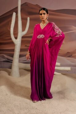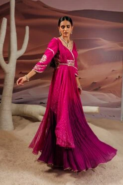 Fuschia Purple Shaded Pleated Cape With Embroidered Yoke And Sleeve
