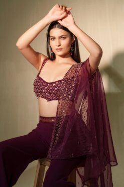 Aubergine Crystal And Sequin Blouse Paired With Flared Pants And Cape
