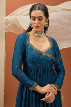 Blue Floral Printed Drape Saree With Navy Blue Raw Silk Blouse