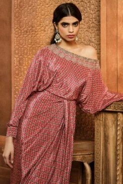 Pearl Draped Skirt In Metallic Lycra With Pleat Detailing And Pearl Embroidered Crop Top