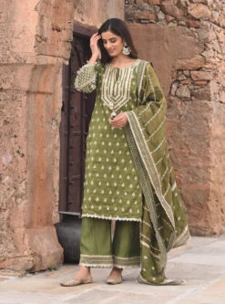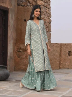 Mulmul Luxe Tissue Heer Sage Green Kurta With Mulmul Organza Satin Heer Sage Green Garara