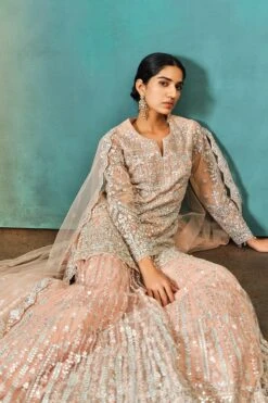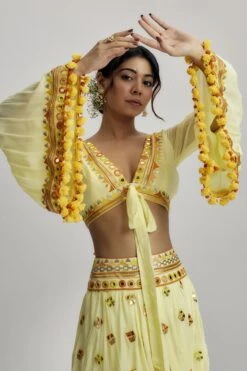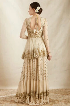 Off-White Sequins Saree And Blouse With Cowl Sleeves And Tassels