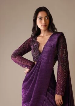 Purple Printed Embroidered Batwing Top With Draped Skirt Set