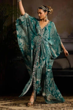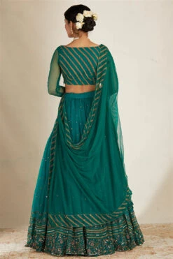 Teal Blue Saree In Georgette With Ruffle Frill And A Chunky Embroidered Belt