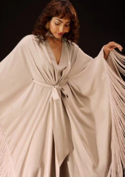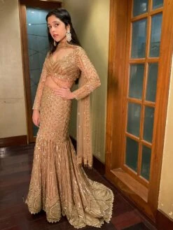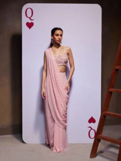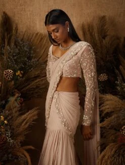 Champagne Beige Ready-Pleated Saree, Crafted In Crush With Side Zip Closure