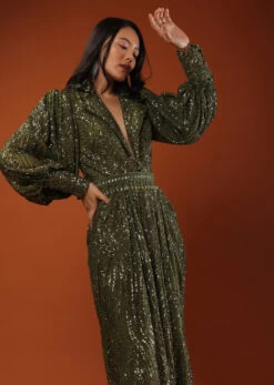 Chive Green Gown With High Collar Neckline In Sequins Embroidery, Bishop Sleeves With Padding