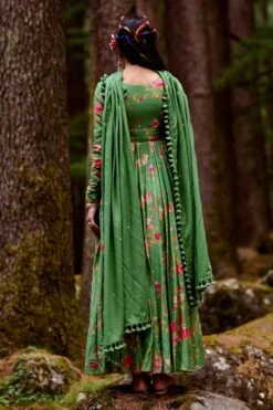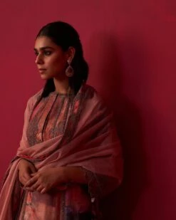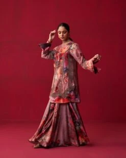 Fuchsia Orange Floral Printed Georgette Angrakha Style Anarkali