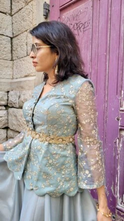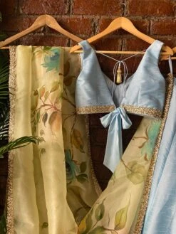 Sky Blue Raw Silk Lehenga Set With Lime Handpainted Dupatta Set