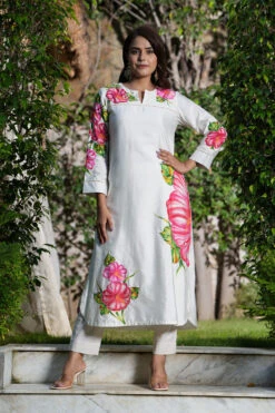 Cream White Kurta Pant Set In Silver Foil Fabric With Tiki Work