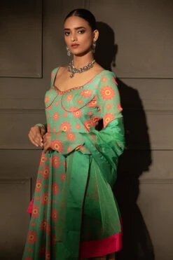 Orange Viscose Chinon Embellished Bead Cape Geometric Printed Draped Skirt Set