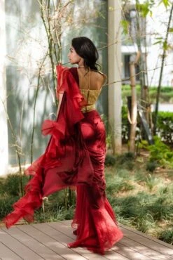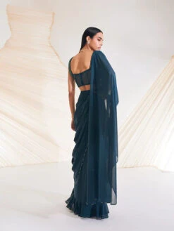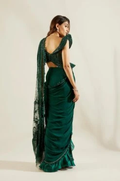 Fern Green Naksha Print Pre Draped Asymmetric Layered Saree Set
