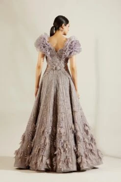 Jewel Purple Drape Gown In Floral Printed Satin With A Cowl Draped Pallu And Moti Embroidered Belt
