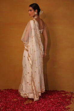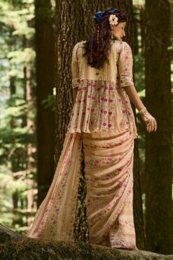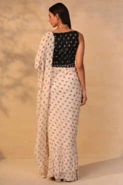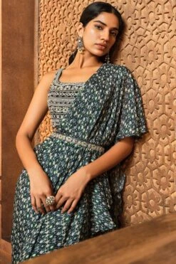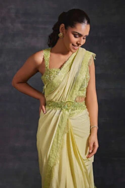 Olive Green Ready Pleated Saree In Crepe With Sequins Pallu And Matching Sleeveless Blouse