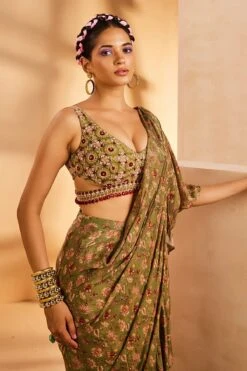 Orange Printed Choli And Pre Draped Saree Set With Embroidery