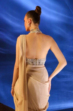 Pearl Ready Pleated Saree In Metallic Lycra With Organza Blouse Featuring Bishop Sleeves Online