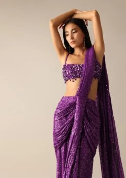 Purple Georgette Habiba Pre-stitched Ruffle Saree With Blouse