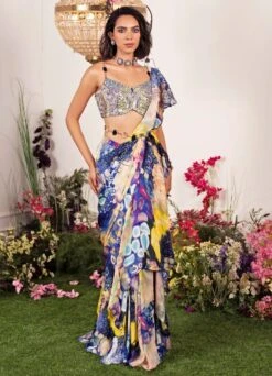 Green Floral Print Drape Saree With Ruffles And Plunge V Neck Blouse
