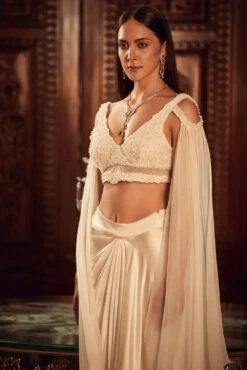 Laurel Green Saree In Satin With Floral Print And Sequins Blouse With Front Cut Out